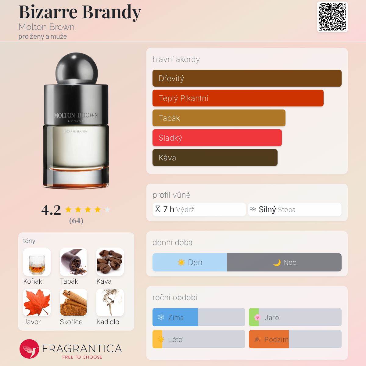 Bizarre Brandy podle Molton Brown je Orientální Spicy vůně pro ženy a muže. Bizarre Brandy byl/a uveden/a v roce 2019. "Nosem" za touto vůní je Karine Dubreuil-Sereni. Vrchní tóny jsou Skořice, Pomeranč, Zázvor a Kardamom; střední tóny jsouBrandy, Káva a Javor ; základní tóny jsou Tabák, Kadidlo a Cedr.