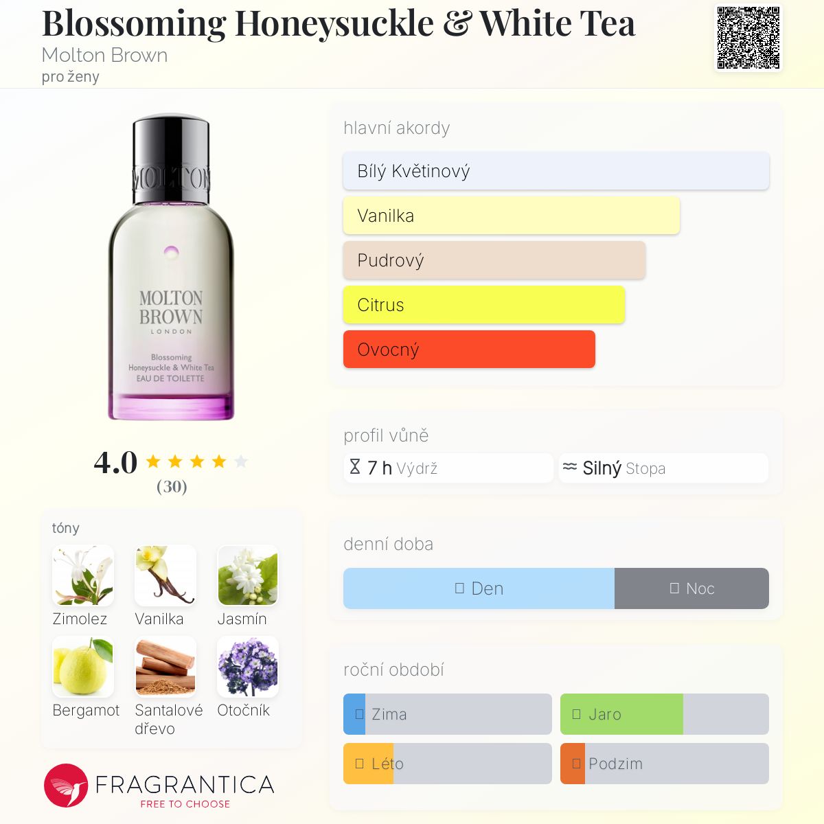 Blossoming Honeysuckle & White Tea podle Molton Brown je Floral vůně pro ženy. Blossoming Honeysuckle & White Tea byl/a uveden/a v roce 2015. "Nosem" za touto vůní je Shyamala Maisondieu. Vrchní tóny jsou Bergamot a Mandarinka; střední tóny jsouZimolez, Jasmín a Bílý čaj ; základní tóny jsou Vanilka, Santalové dřevo a Otočník.