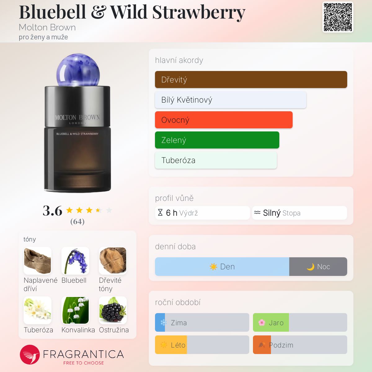 Bluebell & Wild Strawberry podle Molton Brown je Floral Fruity vůně pro ženy a muže. Toto je nová vůně. Bluebell & Wild Strawberry byl/a uveden/a v roce 2025. "Nosem" za touto vůní je Véronique Nyberg. Vrchní tóny jsou Ostružina, Bergamot, Lesní jahoda a Galbanum; střední tóny jsouZvonek, Tuberóza, Konvalinka a Koriandr ; základní tóny jsou Naplavené dříví, Bílé dřevo, Jantar (ambra) a Santalové dřevo.