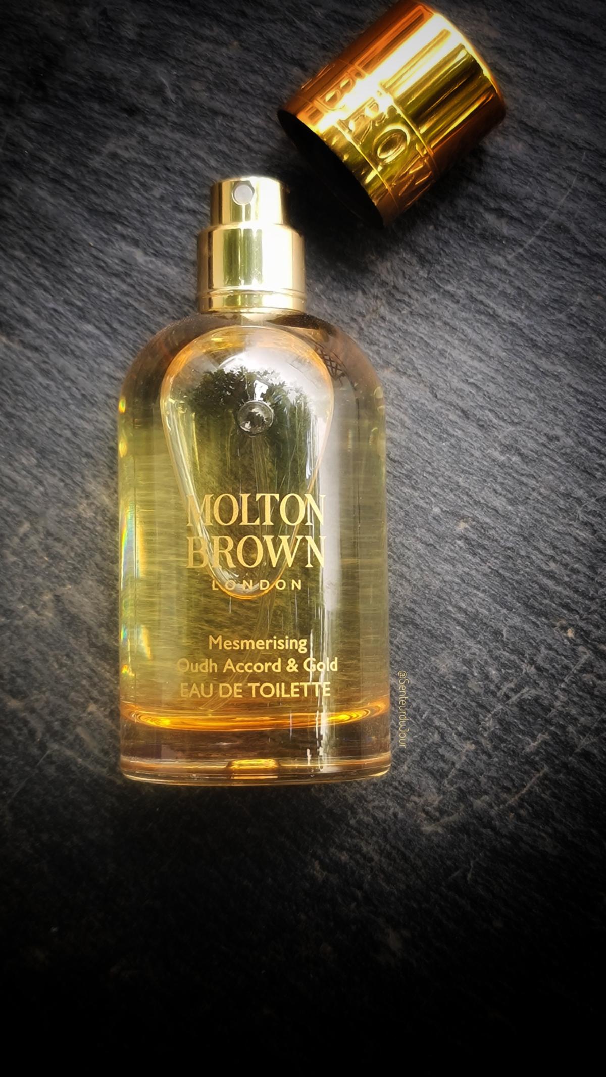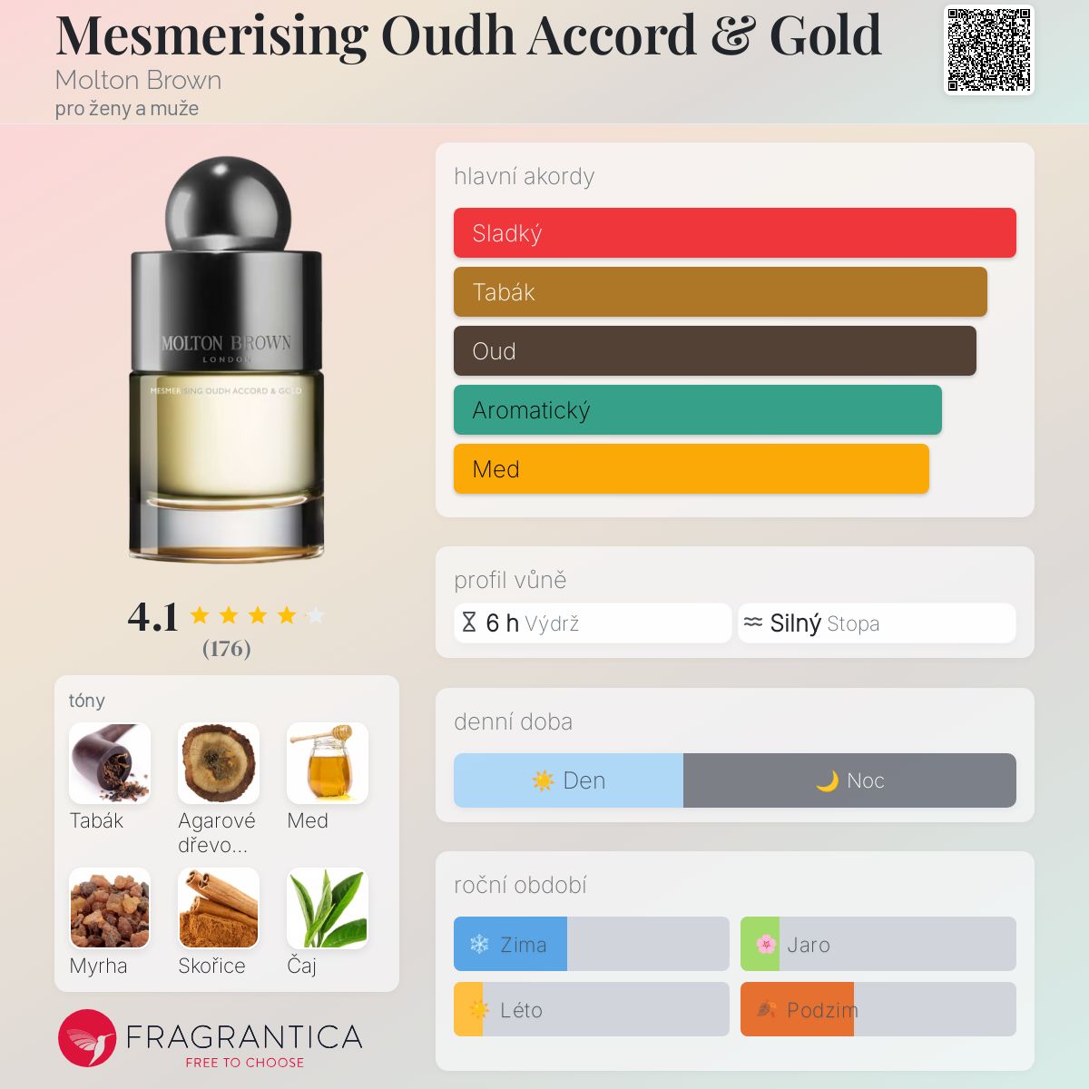 Mesmerising Oudh Accord & Gold podle Molton Brown je Woody Aromatic vůně pro ženy a muže. Mesmerising Oudh Accord & Gold byl/a uveden/a v roce 2015. Vrchní tóny jsou Skořice a Muškátový oříšek; střední tóny jsouMyrha, Černý čaj a Elimi ; základní tóny jsou Tabák, Agarové dřevo (oud), Med a Vetiver.