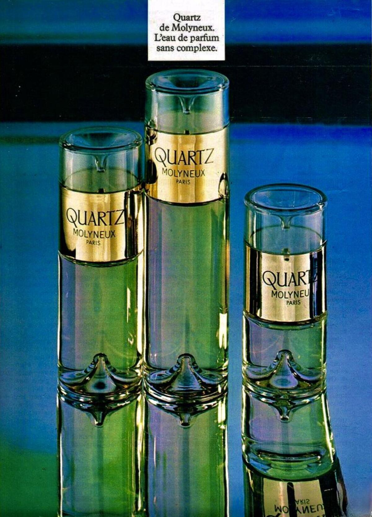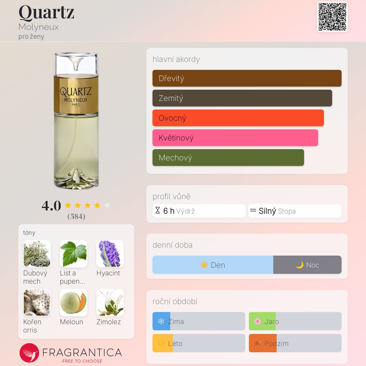 Quartz podle Molyneux je Floral vůně pro ženy. Quartz byl/a uveden/a v roce 1977. "Nosem" za touto vůní je Raymond Chaillan. Vrchní tóny jsou Kasie, Hyacint a Broskev; střední tóny jsouKořen kosatce, Meloun, Zimolez, Karafiát, Jasmín a Růže ; základní tóny jsou Dubový mech, Santalové dřevo, Pižmo, Cedr, Benzoin, Jantar (ambra) a Pačuli.