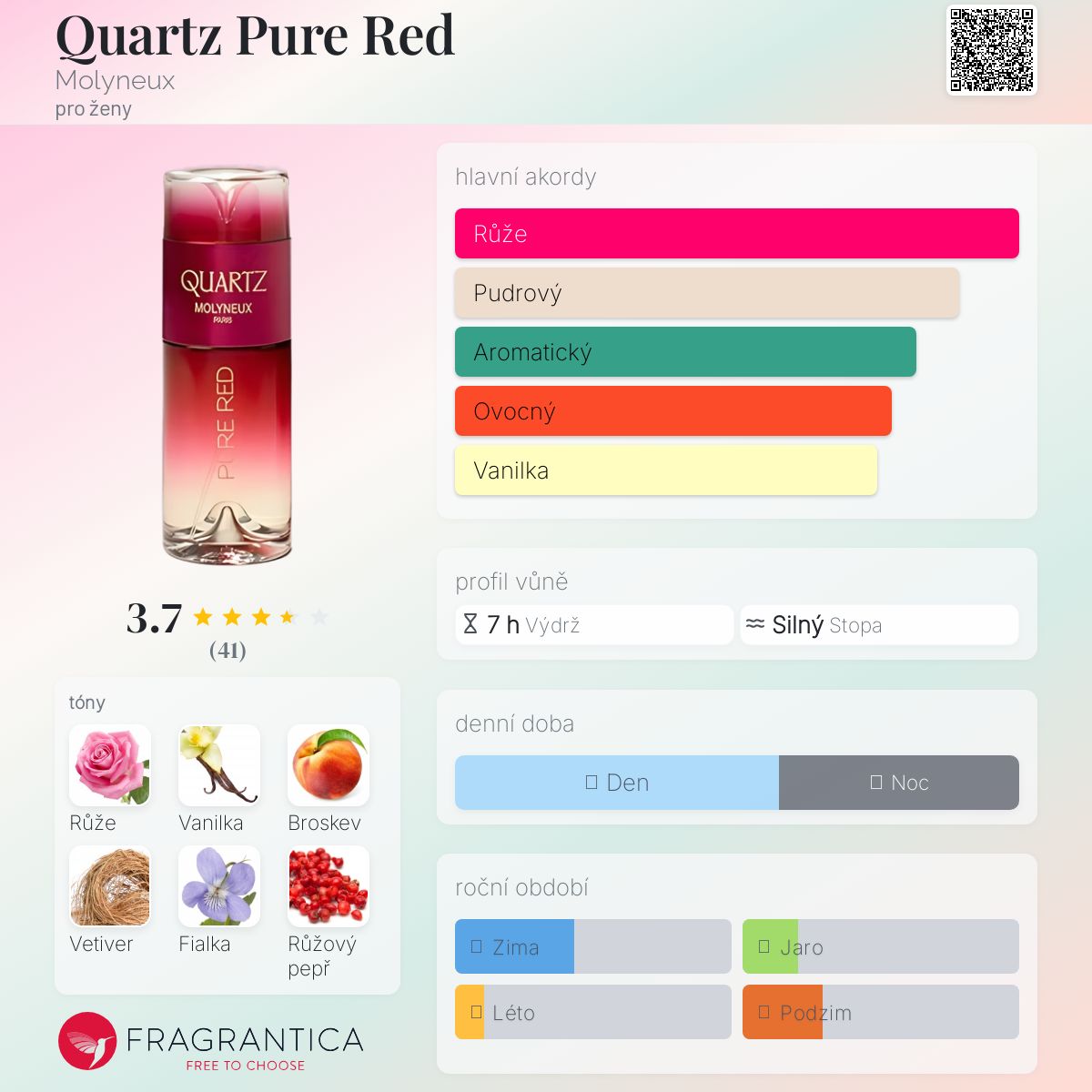 Quartz Pure Red podle Molyneux je Orientální Floral vůně pro ženy. Quartz Pure Red byl/a uveden/a v roce 2008. Vrchní tóny jsou Broskev, Růžový pepř, Zelené jablko, Mandarinka a Bergamot; střední tóny jsouRůže, Fialka, Šalvěj a Jasmín ; základní tóny jsou Vanilka, Vetiver, Pižmo a Jantar (ambra).