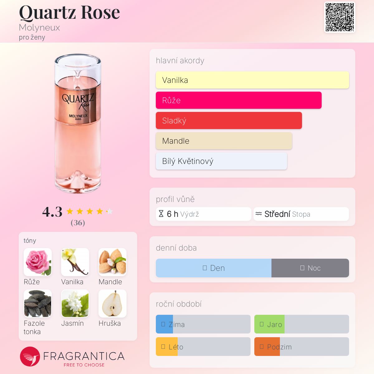 Quartz Rose podle Molyneux je Floral vůně pro ženy. Quartz Rose byl/a uveden/a v roce 2018. Vrchní tóny jsou Mandle, Hruška a Citrón; střední tóny jsouRůže, Jasmín a Tuberóza ; základní tóny jsou Vanilka, Fazole tonka a Santalové dřevo.