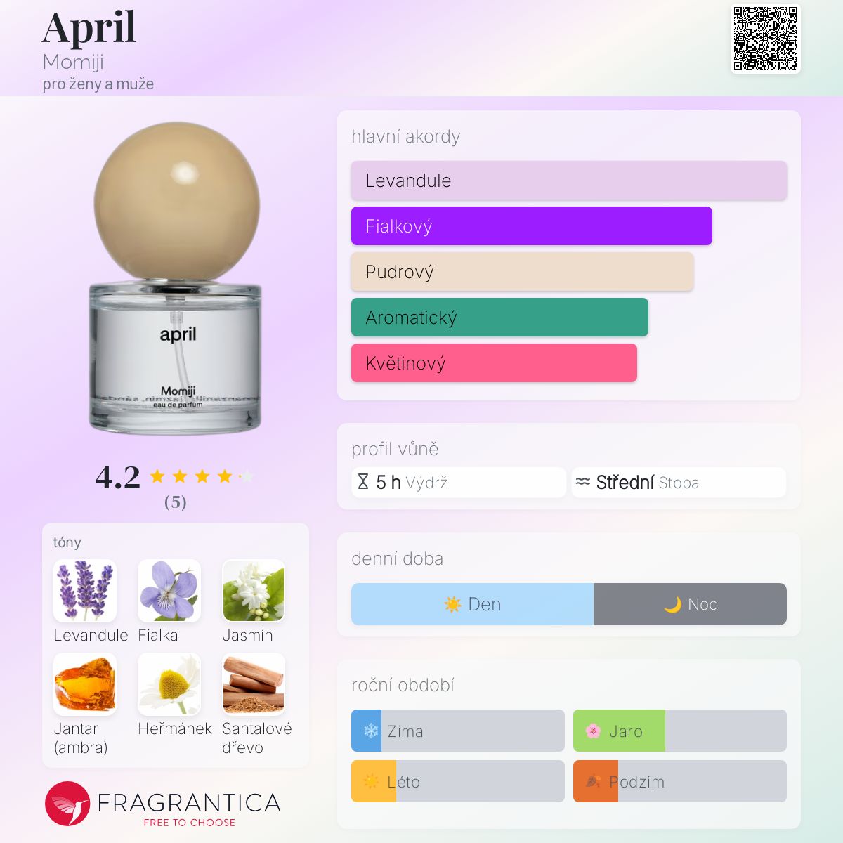 April podle Momiji je Floral vůně pro ženy a muže. Toto je nová vůně. April byl/a uveden/a v roce 2024. Vrchní tóny jsou Levandule a Heřmánek; střední tóny jsouFialka a Jasmín ; základní tóny jsou Jantar (ambra), Santalové dřevo a Cedr.