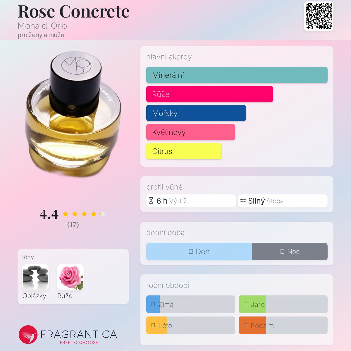 Rose Concrete podle Mona di Orio je Floral vůně pro ženy a muže. Rose Concrete byl/a uveden/a v roce 2019. "Nosem" za touto vůní je Fredrik Dalman.