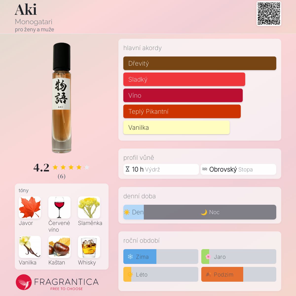 Aki podle Monogatari je Orientální Vanilla vůně pro ženy a muže. Toto je nová vůně. Aki byl/a uveden/a v roce 2025. "Nosem" za touto vůní je Eugene Ti. Vrchní tóny jsou Červené víno a Whisky; střední tóny jsouKaštan, Slaměnka, Pačuli a Růže ; základní tóny jsou Javor, Vanilka a Pižmo.