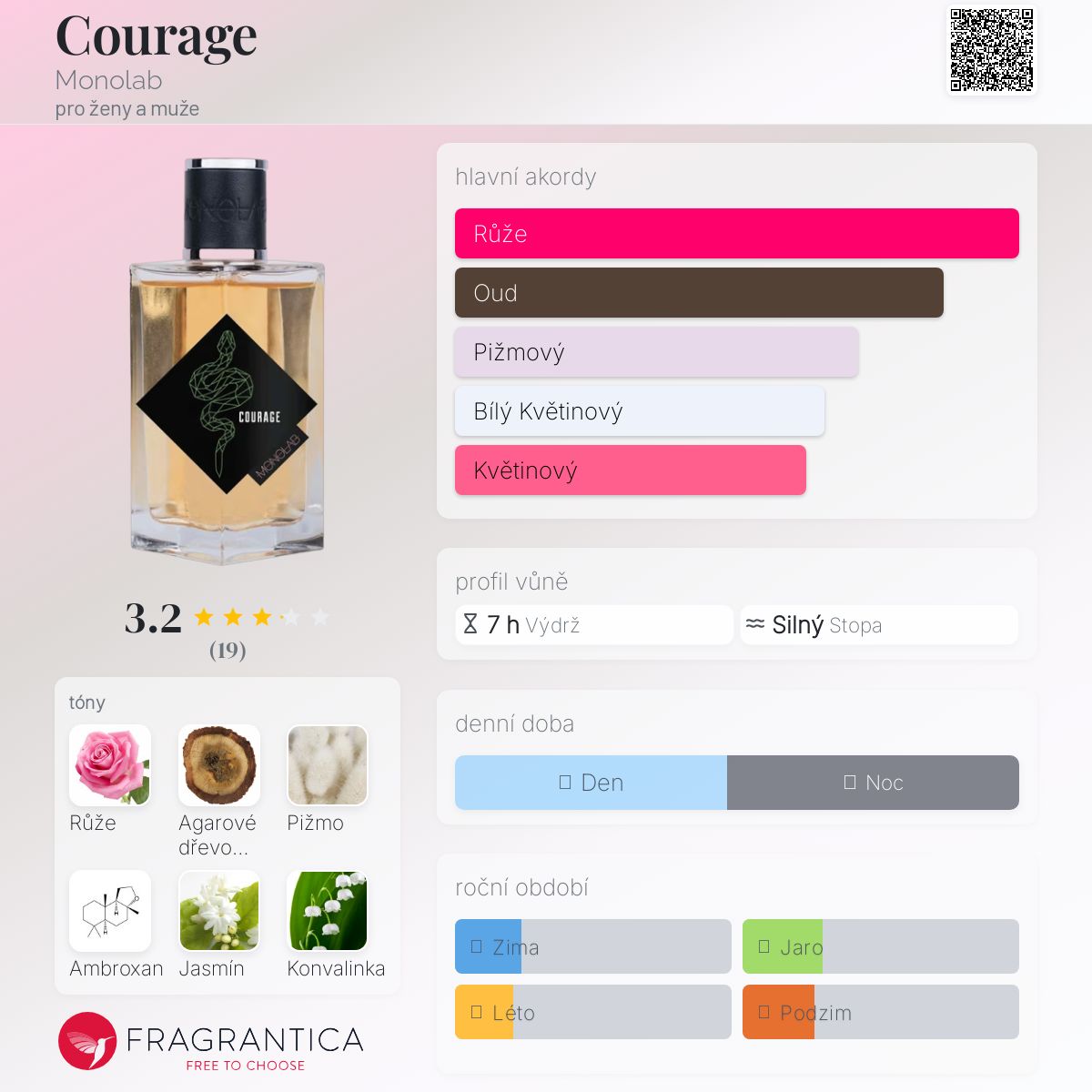 Courage podle Monolab je vůně pro ženy a muže. Courage byl/a uveden/a v roce 2019. Vrchní tóny jsou Damašská růže a Jasmín; střední tóny jsouAgarové dřevo (oud) a Konvalinka ; základní tóny jsou Pižmo a Ambroxan.