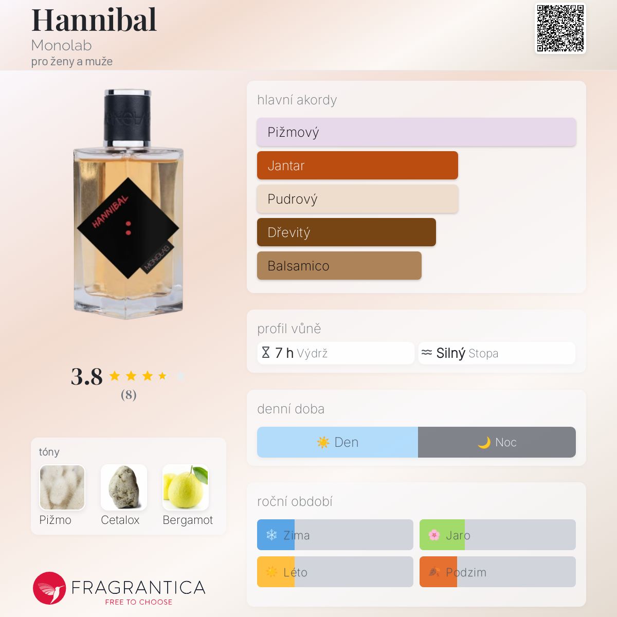 Hannibal podle Monolab je vůně pro ženy a muže. Hannibal byl/a uveden/a v roce 2019. Vrchní tón je Cetalox ; střední tón jeBergamot ; základní tón je Bílé pižmo.