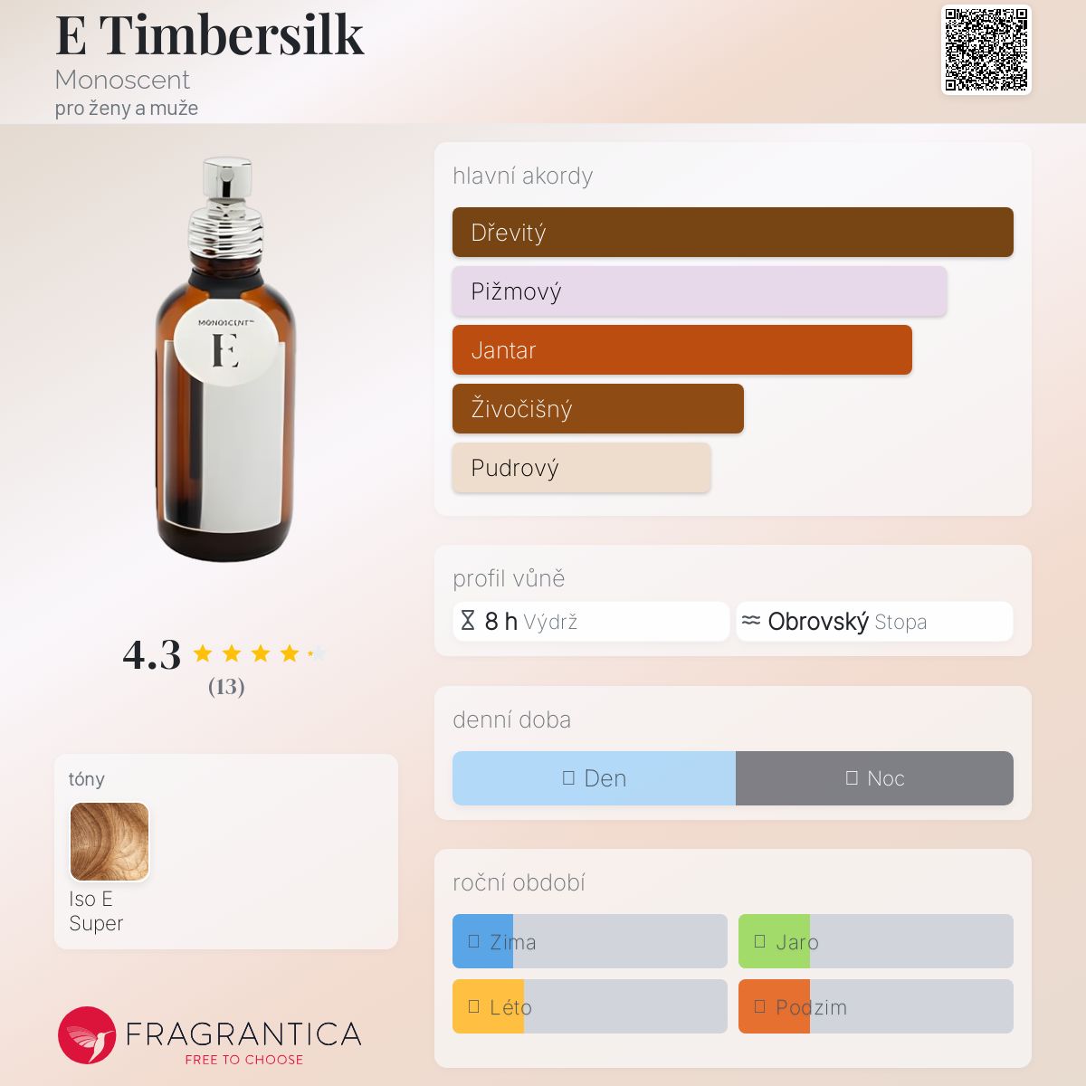 E Timbersilk podle Monoscent je Woody Floral Musk vůně pro ženy a muže. E Timbersilk byl/a uveden/a v roce 2016.