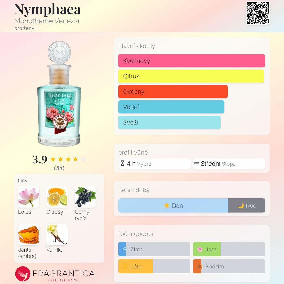 Nymphaea podle Monotheme Venezia je Floral Fruity vůně pro ženy. Nymphaea byl/a uveden/a v roce 2020. Vrchní tón je Citrusy ; střední tóny jsouLotus a Černý rybíz ; základní tóny jsou Jantar (ambra) a Vanilka.