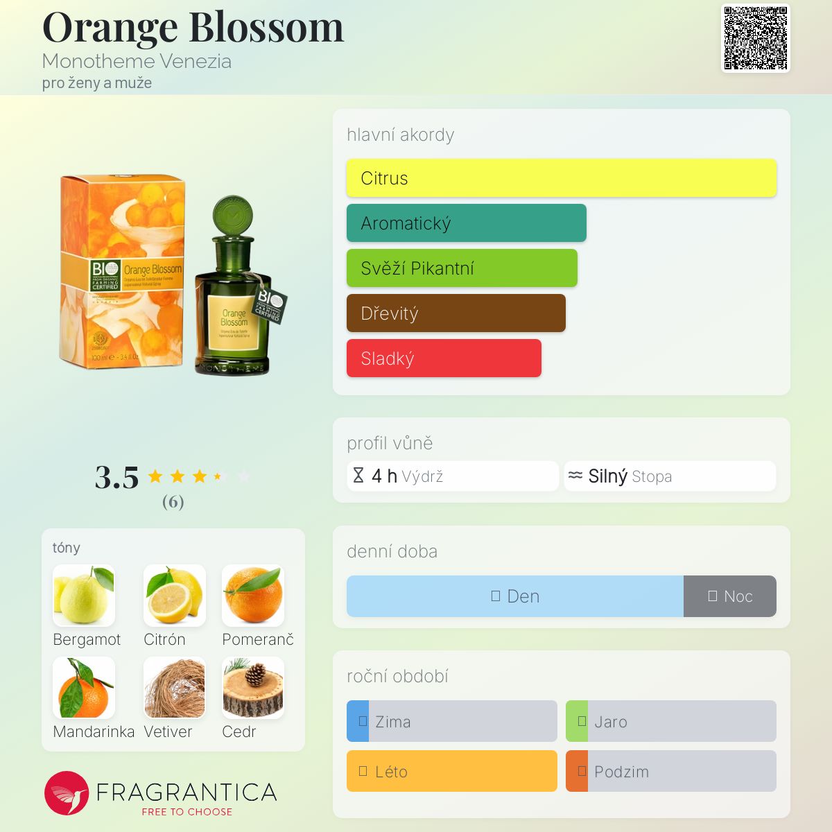Orange Blossom podle Monotheme Venezia je Citrus Aromatic vůně pro ženy a muže. Orange Blossom byl/a uveden/a v roce 2012. Vrchní tóny jsou Kalábrijský bergamot a Sicilský citron; střední tóny jsouBrazilský pomeranč a Sicilská mandarinka ; základní tóny jsou Java vetiverový olej a Extrakt z bílého cedru.