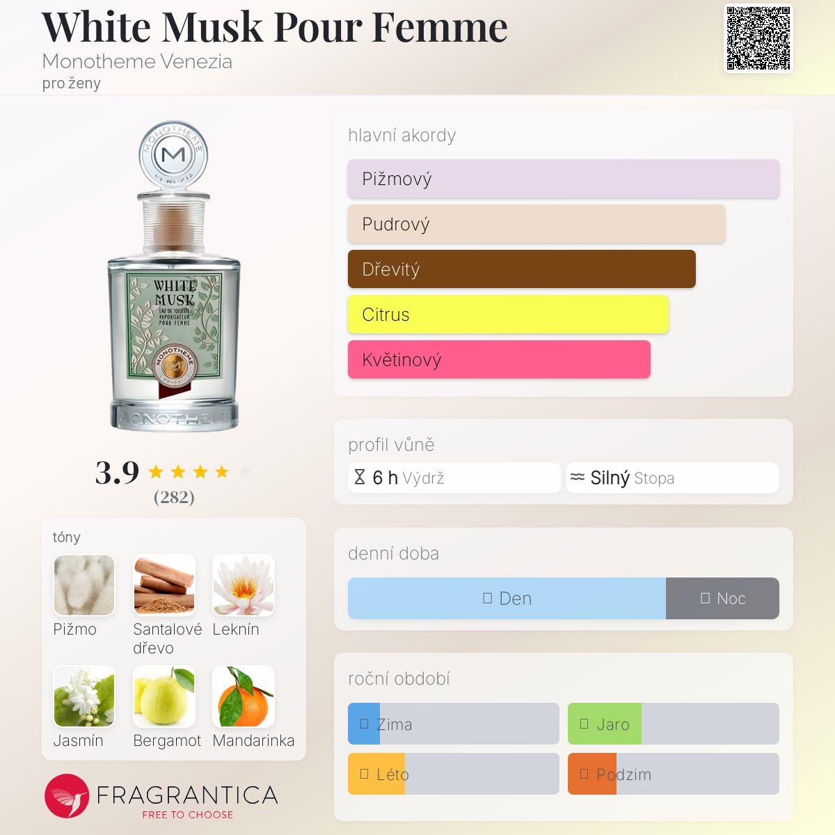 White Musk Pour Femme podle Monotheme Venezia je Floral Woody Musk vůně pro ženy. "Nosem" za touto vůní je Lorenzo Vidal. Vrchní tóny jsou Bergamot a Mandarinka; střední tóny jsouLeknín a Jasmín ; základní tóny jsou Pižmo, Santalové dřevo a Pačuli.