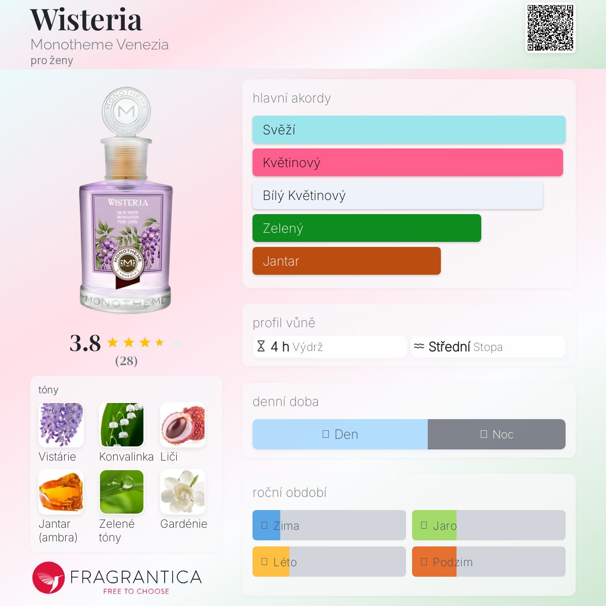 Wisteria podle Monotheme Venezia je vůně pro ženy. Toto je nová vůně. Wisteria byl/a uveden/a v roce 2024. Vrchní tóny jsou Liči, Zelené tóny a Pomeranč; střední tóny jsouVistárie, Konvalinka a Gardénie ; základní tóny jsou Jantar (ambra), Bílé pižmo a Dřevité tóny.
