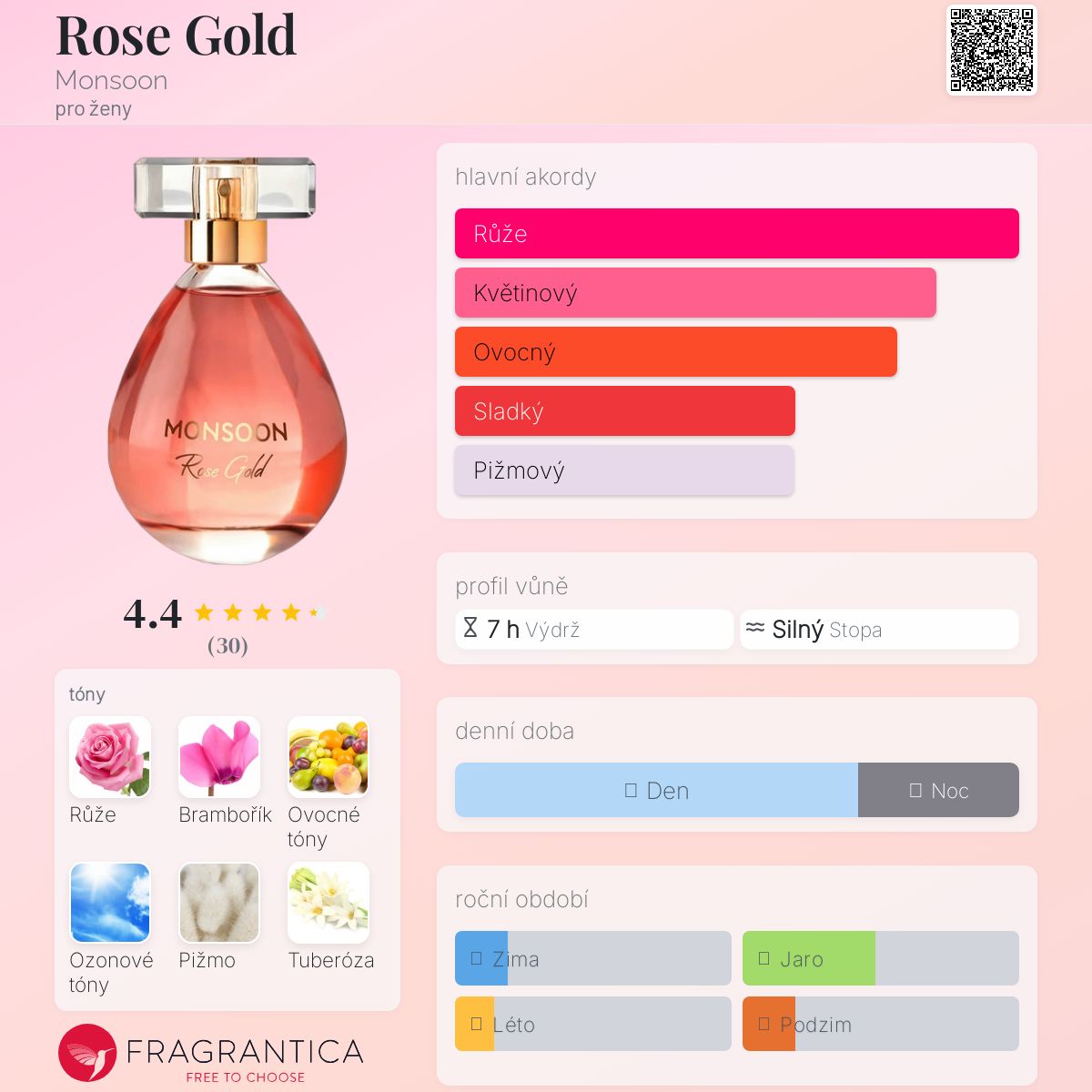 Rose Gold podle Monsoon je Floral vůně pro ženy. Rose Gold byl/a uveden/a v roce 2015. Vrchní tóny jsou Ovoce, Ozonové tóny a Citrón; střední tóny jsouRůže, Brambořík, Tuberóza a Neroli ; základní tóny jsou Pižmo, Vanilka, Dřevité tóny, Jantar (ambra) a Mech.