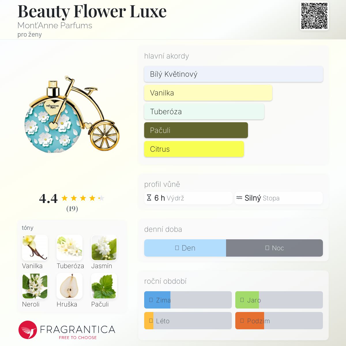 Beauty Flower Luxe podle Mont’Anne Parfums je Floral Fruity vůně pro ženy. Beauty Flower Luxe byl/a uveden/a v roce 2019. Vrchní tóny jsou Hruška a Bergamot; střední tóny jsouTuberóza, Jasmín a Neroli ; základní tóny jsou Vanilka a Pačuli.