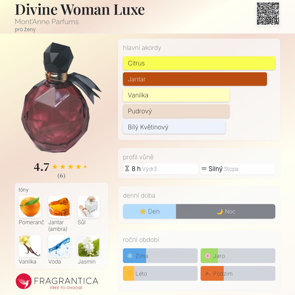 Divine Woman Luxe podle Mont’Anne Parfums je Floral Fruity vůně pro ženy. Divine Woman Luxe byl/a uveden/a v roce 2017. Vrchní tóny jsou Zelený pomeranč, Sůl a Vanilka; střední tóny jsouVodnaté tóny, Jasmín a Pižmo ; základní tóny jsou Jantar (ambra) a Zázvor.