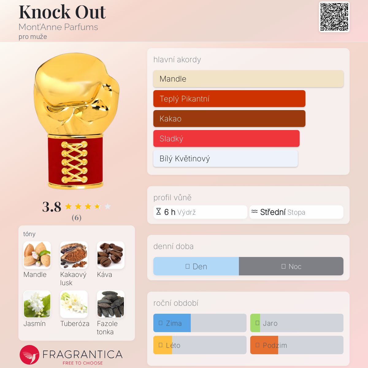Knock Out podle Mont’Anne Parfums je Aromatic vůně pro muže. Knock Out byl/a uveden/a v roce 2017. Vrchní tóny jsou Mandle a Káva; střední tóny jsouJasmín a Tuberóza ; základní tóny jsou Kakao a Fazole tonka.