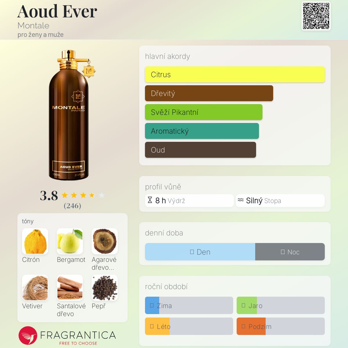 Aoud Ever podle Montale je Woody Aromatic vůně pro ženy a muže. Aoud Ever byl/a uveden/a v roce 2012. "Nosem" za touto vůní je Pierre Montale. Vrchní tóny jsou Citrón, Bergamot, Agarové dřevo (oud) a Kalábrijská mandarinka; střední tóny jsouVetiver, Bílé santalové dřevo, Černý pepř a Pačuli ; základní tóny jsou Kůže, Ambra a Fazole tonka.