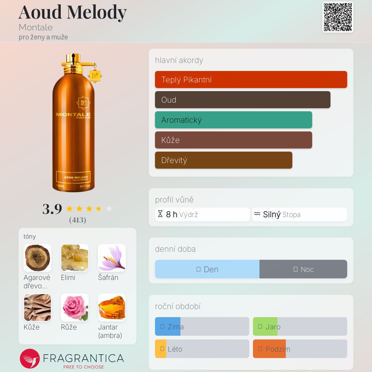 Aoud Melody podle Montale je Leather vůně pro ženy a muže. Aoud Melody byl/a uveden/a v roce 2014. "Nosem" za touto vůní je Pierre Montale. Vrchní tóny jsou Agarové dřevo (oud), Elimi, Šafrán, Kůže a Hřebíček; střední tóny jsouRůže, Ylang-Ylang a Jasmín ; základní tóny jsou Jantar (ambra), Santalové dřevo a Pižmo.