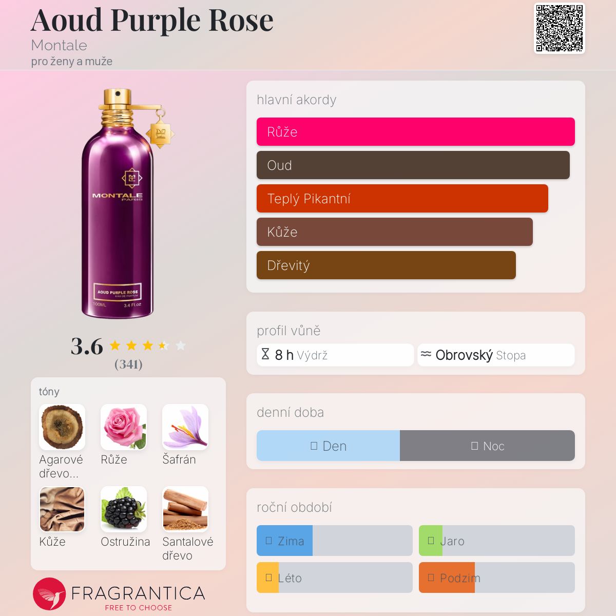 Aoud Purple Rose podle Montale je Orientální Floral vůně pro ženy a muže. Aoud Purple Rose byl/a uveden/a v roce 2012. "Nosem" za touto vůní je Pierre Montale. Vrchní tóny jsou Růže, Šafrán a Ostružina; střední tóny jsouAgarové dřevo (oud), Santalové dřevo a Pačuli ; základní tóny jsou Kůže, Bílé pižmo a Jantar (ambra).