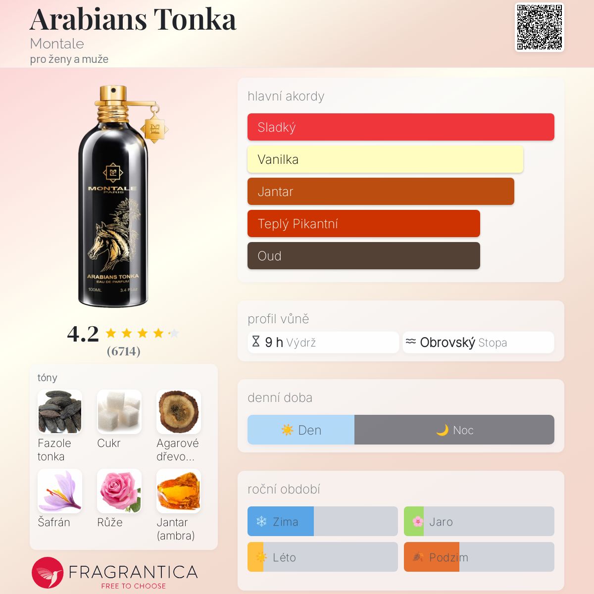 Arabians Tonka podle Montale je Orientální Woody vůně pro ženy a muže. Arabians Tonka byl/a uveden/a v roce 2019. Vrchní tóny jsou Šafrán a Bergamot; střední tóny jsouAgarové dřevo (oud) a Bulharská růže ; základní tóny jsou Fazole tonka, Cukrová třtina, Jantar (ambra), Bílé pižmo a Dubový mech.