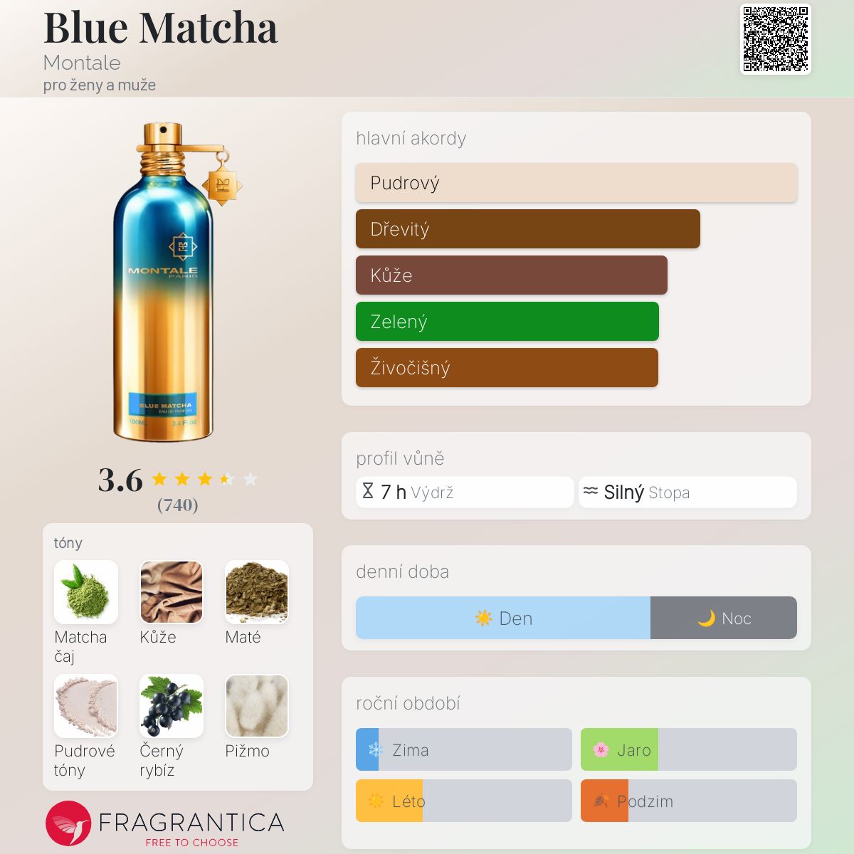 Blue Matcha podle Montale je vůně pro ženy a muže. Blue Matcha byl/a uveden/a v roce 2021. "Nosem" za touto vůní je Pierre Montale. Vrchní tóny jsou Matcha čaj, Černý rybíz, Citrón, Bergamot a Sicilská mandarinka; střední tóny jsouKůže, Cedr, Tabák a List pačuli ; základní tóny jsou Maté, Pudrové tóny, Pižmo a Ambra.