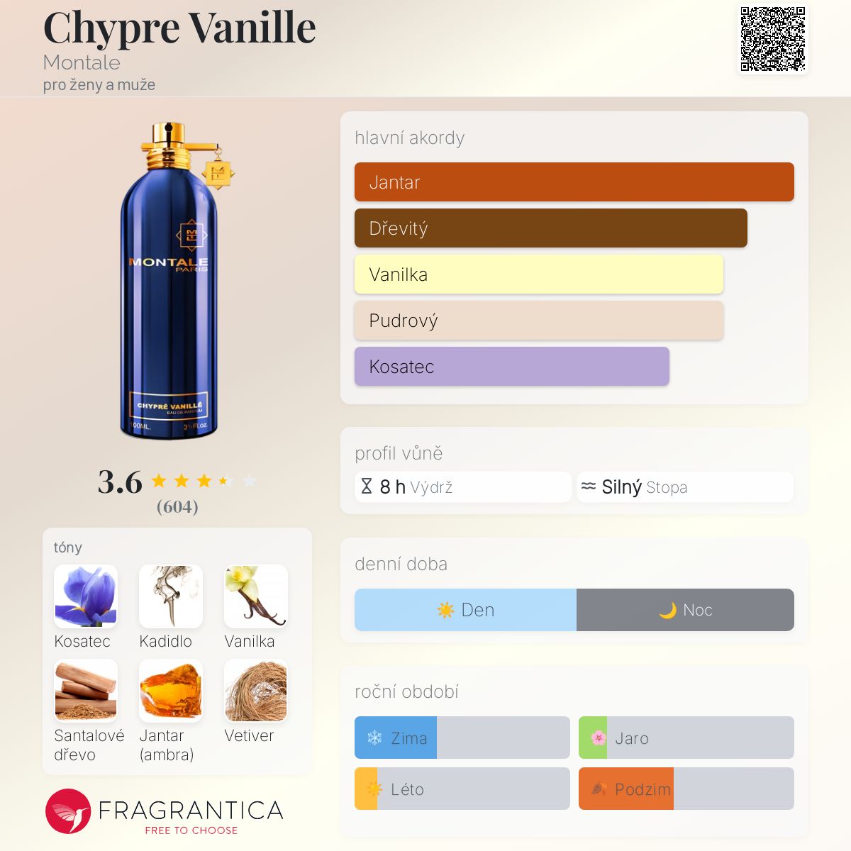 Chypre Vanille podle Montale je Orientální Vanilla vůně pro ženy a muže. Chypre Vanille byl/a uveden/a v roce 2006. "Nosem" za touto vůní je Pierre Montale. Vrchní tón je Růže ; střední tóny jsouKadidlo, Vanilka a Jantar (ambra) ; základní tóny jsou Kosatec, Santalové dřevo, Vetiver a Fazole tonka.