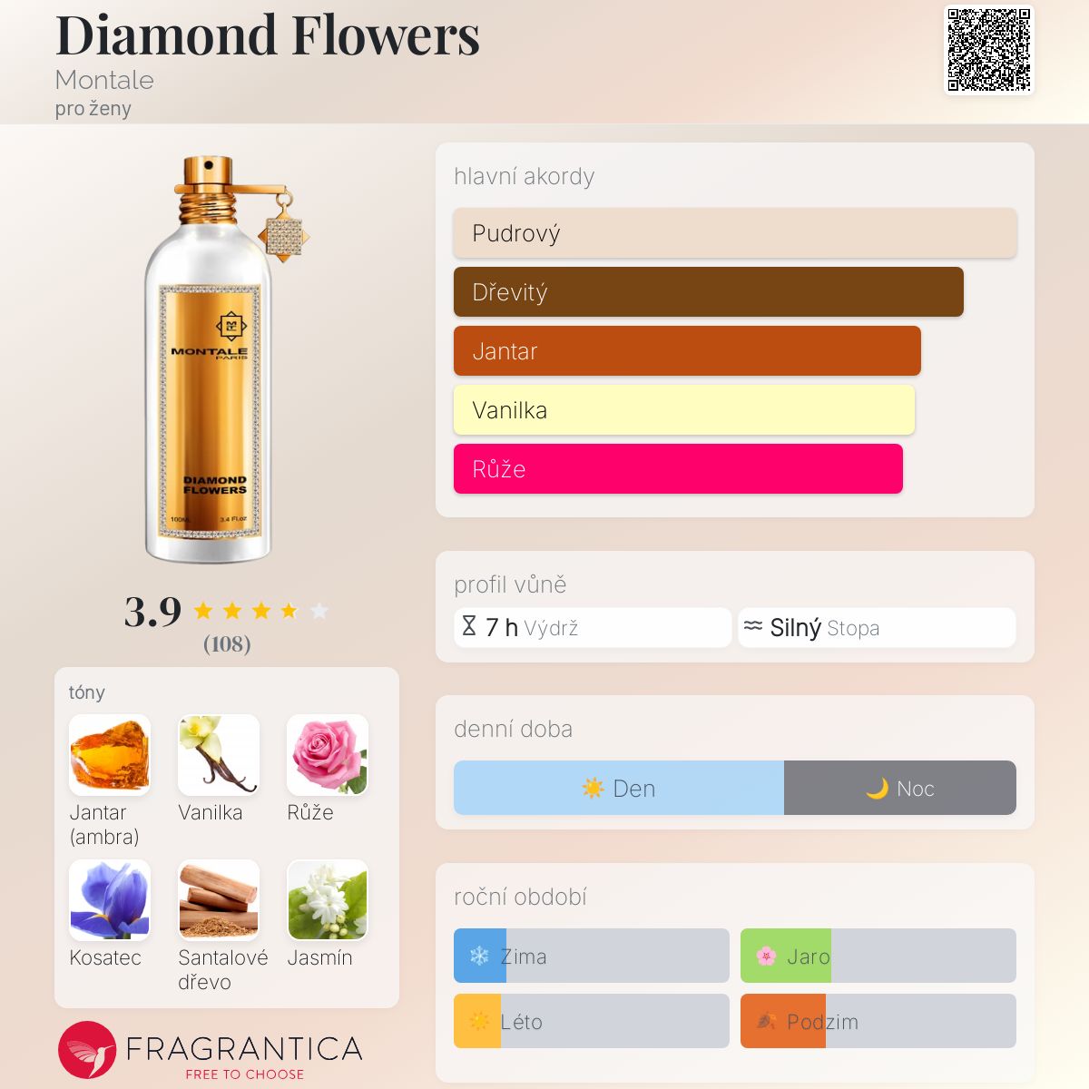 Diamond Flowers podle Montale je Orientální Floral vůně pro ženy. Diamond Flowers byl/a uveden/a v roce 2017. "Nosem" za touto vůní je Pierre Montale. Vrchní tóny jsou Růže, Květ kosatce a Jasmín; střední tóny jsouJantar (ambra) a Vanilka ; základní tóny jsou Santalové dřevo a Mech.