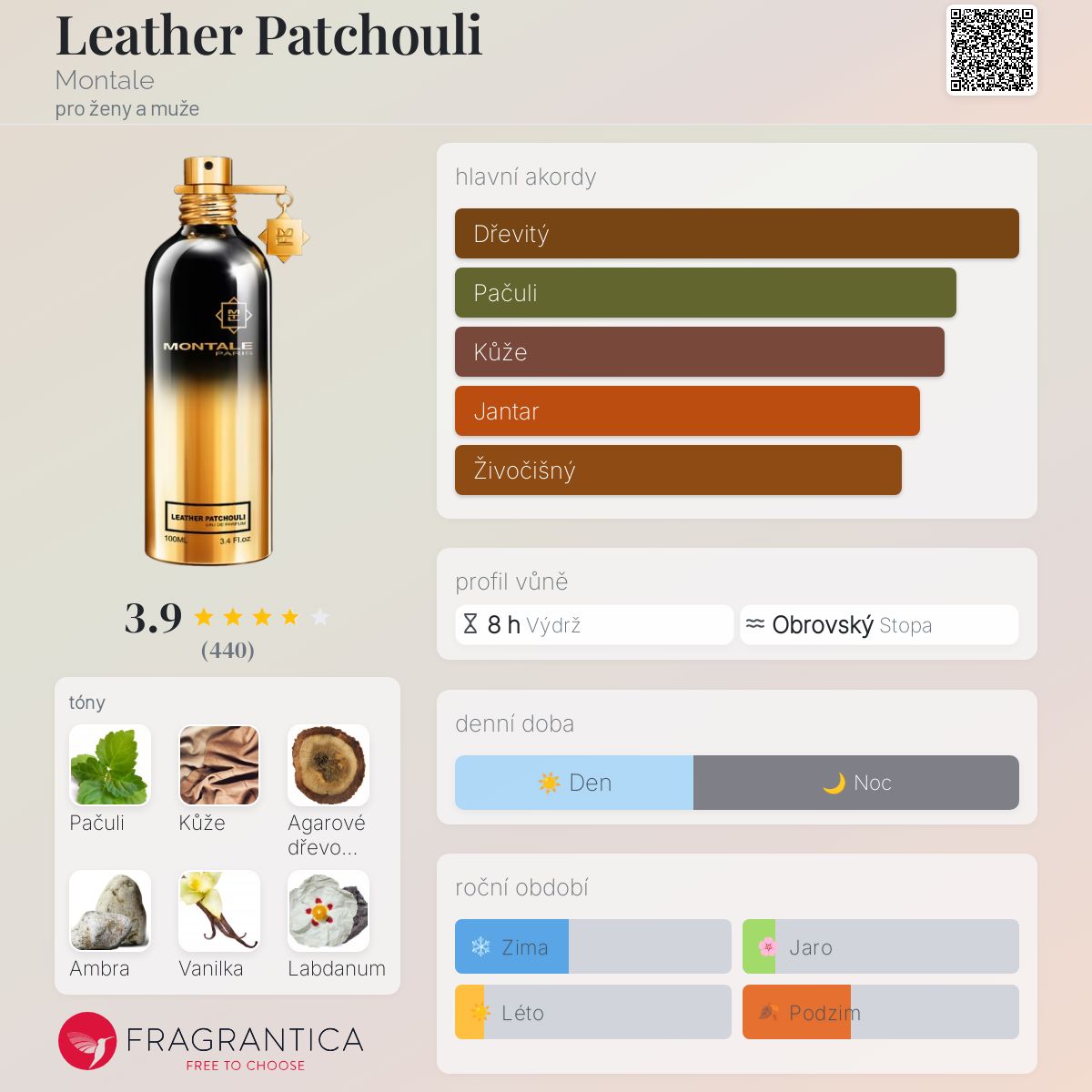 Leather Patchouli podle Montale je Leather vůně pro ženy a muže. Leather Patchouli byl/a uveden/a v roce 2018. Vrchní tóny jsou Pačuli, Kůže, Agarové dřevo (oud) a Labdanum; střední tóny jsouCedr a Santalové dřevo ; základní tóny jsou Ambra, Vanilka a Bílé pižmo.