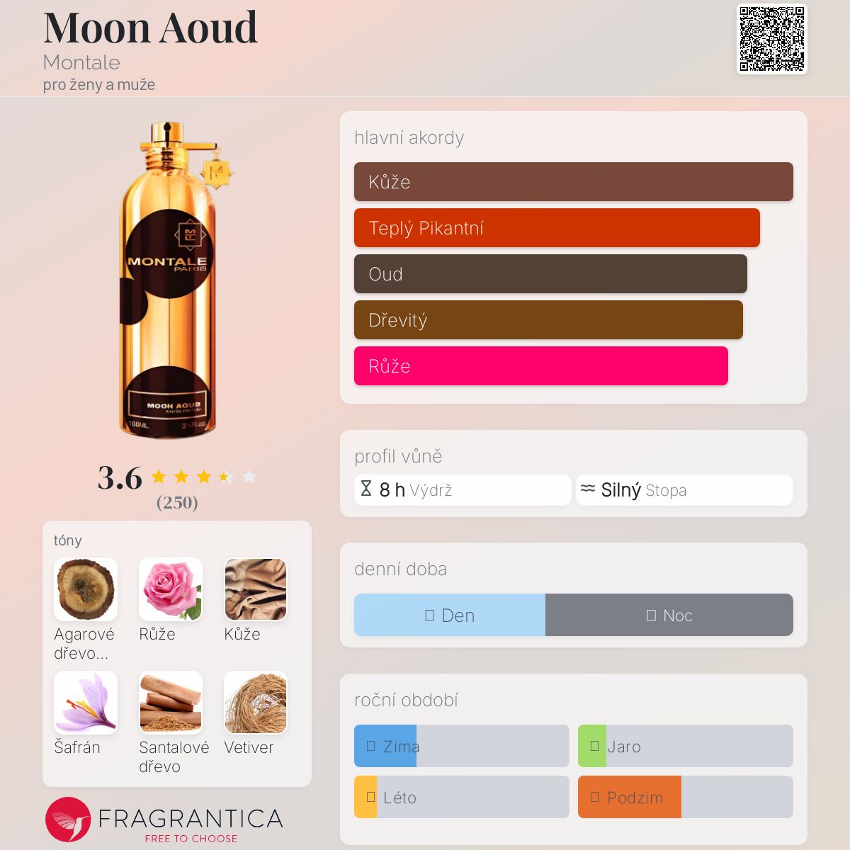 Moon Aoud podle Montale je Orientální Woody vůně pro ženy a muže. Moon Aoud byl/a uveden/a v roce 2011. "Nosem" za touto vůní je Pierre Montale. Vrchní tóny jsou Agarové dřevo (oud), Růže a Šafrán; střední tóny jsouKůže, Vetiver a Pačuli ; základní tóny jsou Santalové dřevo a Jantar (ambra).