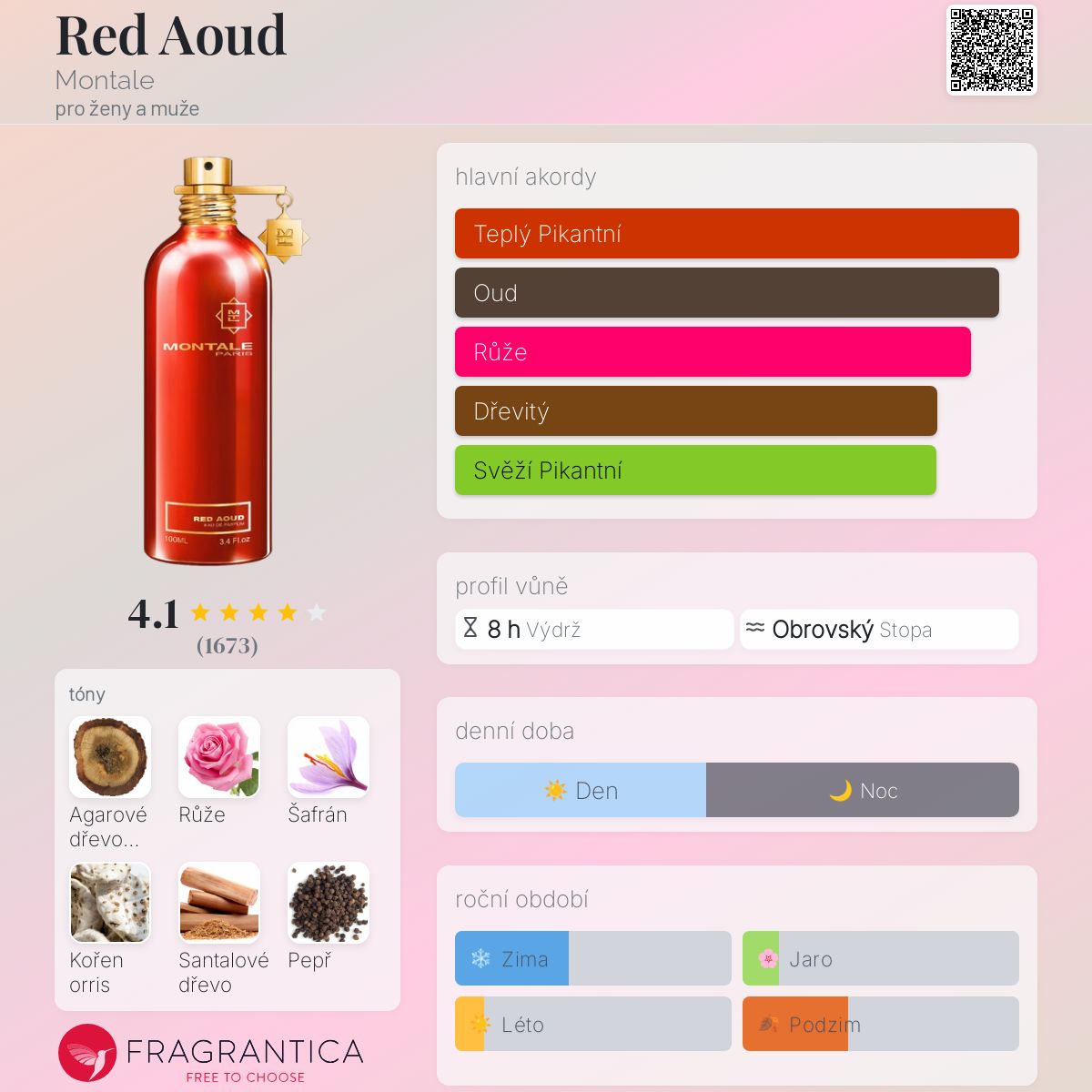 Red Aoud podle Montale je Woody Spicy vůně pro ženy a muže. Red Aoud byl/a uveden/a v roce 2008. "Nosem" za touto vůní je Pierre Montale. Vrchní tóny jsou Agarové dřevo (oud) a Pepř; střední tóny jsouRůže, Šafrán a Římský kmín ; základní tóny jsou Kořen kosatce, Santalové dřevo a Vetiver.