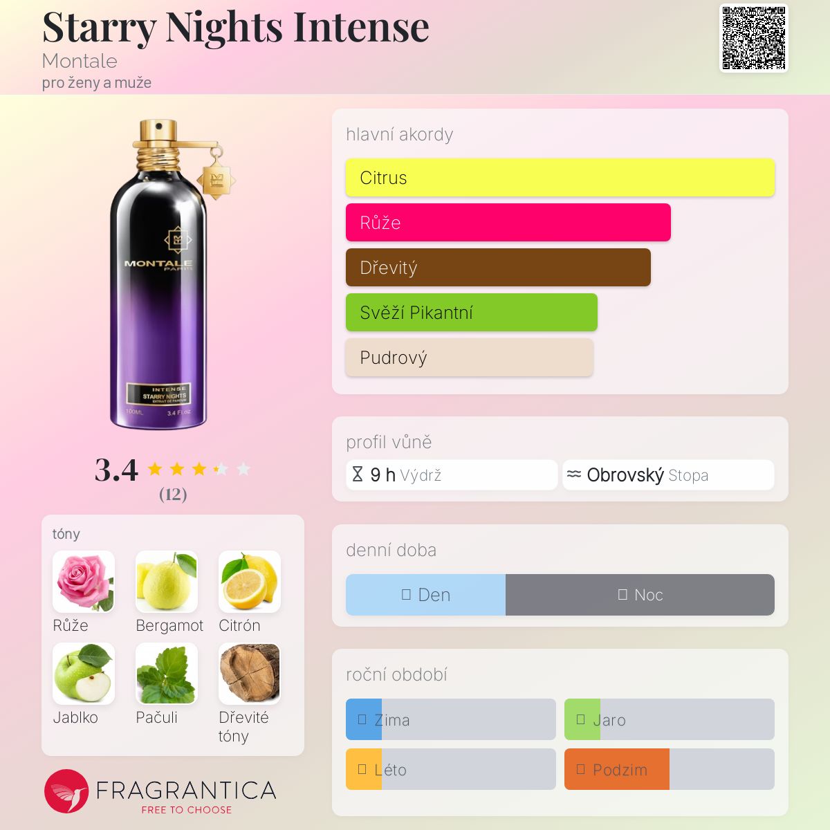 Starry Nights Intense podle Montale je Orientální Floral vůně pro ženy a muže. Toto je nová vůně. Starry Nights Intense byl/a uveden/a v roce 2025. "Nosem" za touto vůní je Pierre Montale. Vrchní tóny jsou Sicilský bergamot, Sicilský citron a Jablko; střední tóny jsouRůže a List pačuli ; základní tóny jsou Dřevité tóny, Bílé pižmo, Jantar (ambra) a Madagaskarská vanilka.