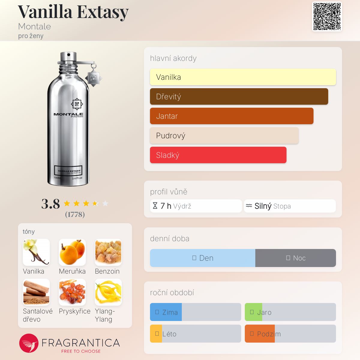 Vanilla Extasy podle Montale je Orientální Vanilla vůně pro ženy. Vanilla Extasy byl/a uveden/a v roce 2008. "Nosem" za touto vůní je Pierre Montale. Vrchní tóny jsou Meruňka a Meruňkový květ; střední tóny jsouVanilka, Ylang-Ylang a Jasmín ; základní tóny jsou Benzoin, Santalové dřevo, Pryskyřice a Mahagon.