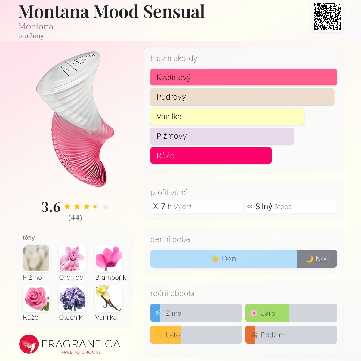 Montana Mood Sensual podle Montana je Floral vůně pro ženy. Montana Mood Sensual byl/a uveden/a v roce 2006. Vrchní tóny jsou Brambořík a Růže; střední tóny jsouOrchidej a Otočník ; základní tóny jsou Pižmo a Vanilka.