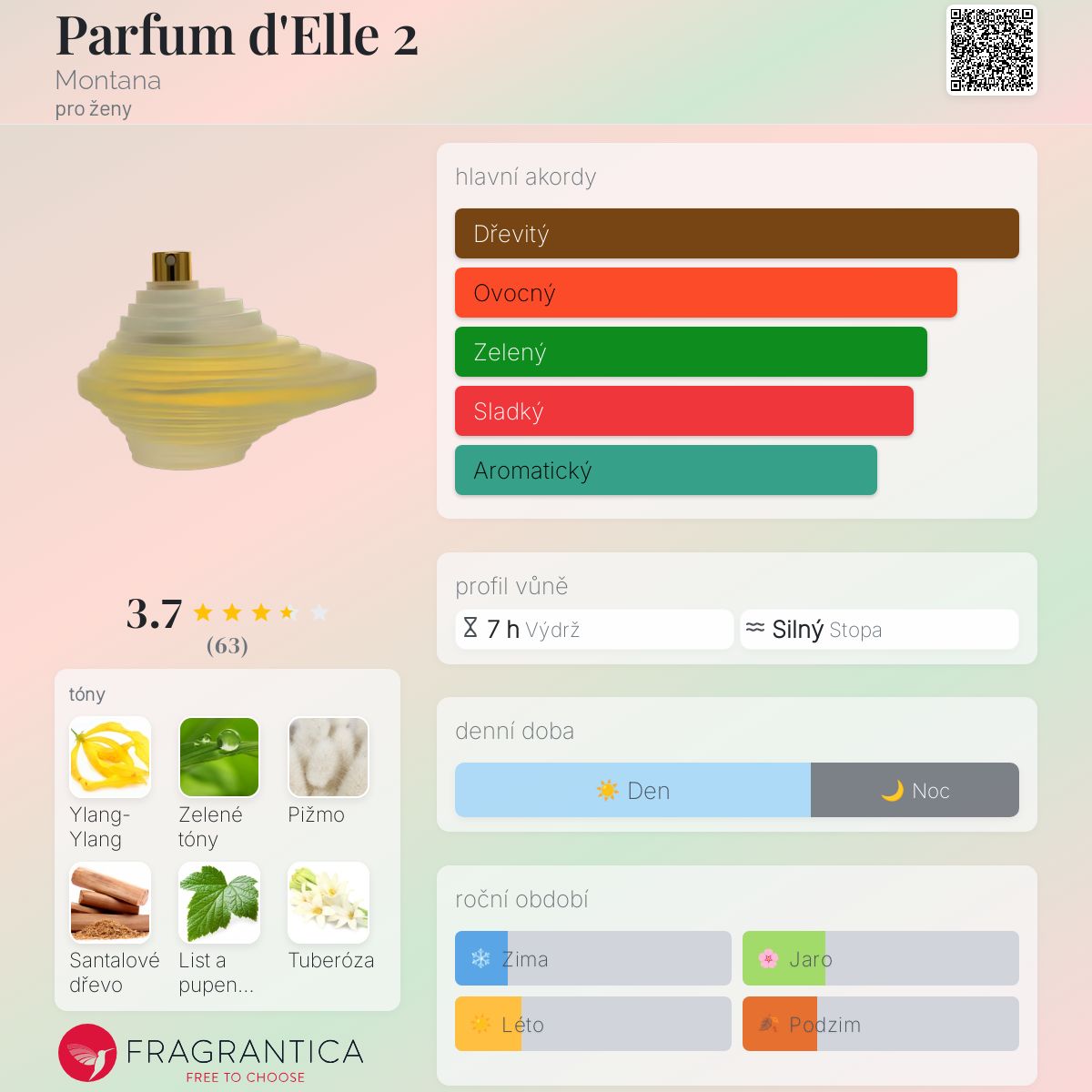 Parfum d'Elle 2 podle Montana je Floral Fruity vůně pro ženy. Parfum d'Elle 2 byl/a uveden/a v roce 2003. Vrchní tóny jsou Zelené tóny, Kasie, Švestka, Broskev a Pepř; střední tóny jsouYlang-Ylang, Santalové dřevo, Tuberóza, Zázvor, Růže, Karafiát a Jasmín ; základní tóny jsou Pižmo, Kokos, Vetiver, Jantar (ambra) a Pačuli.