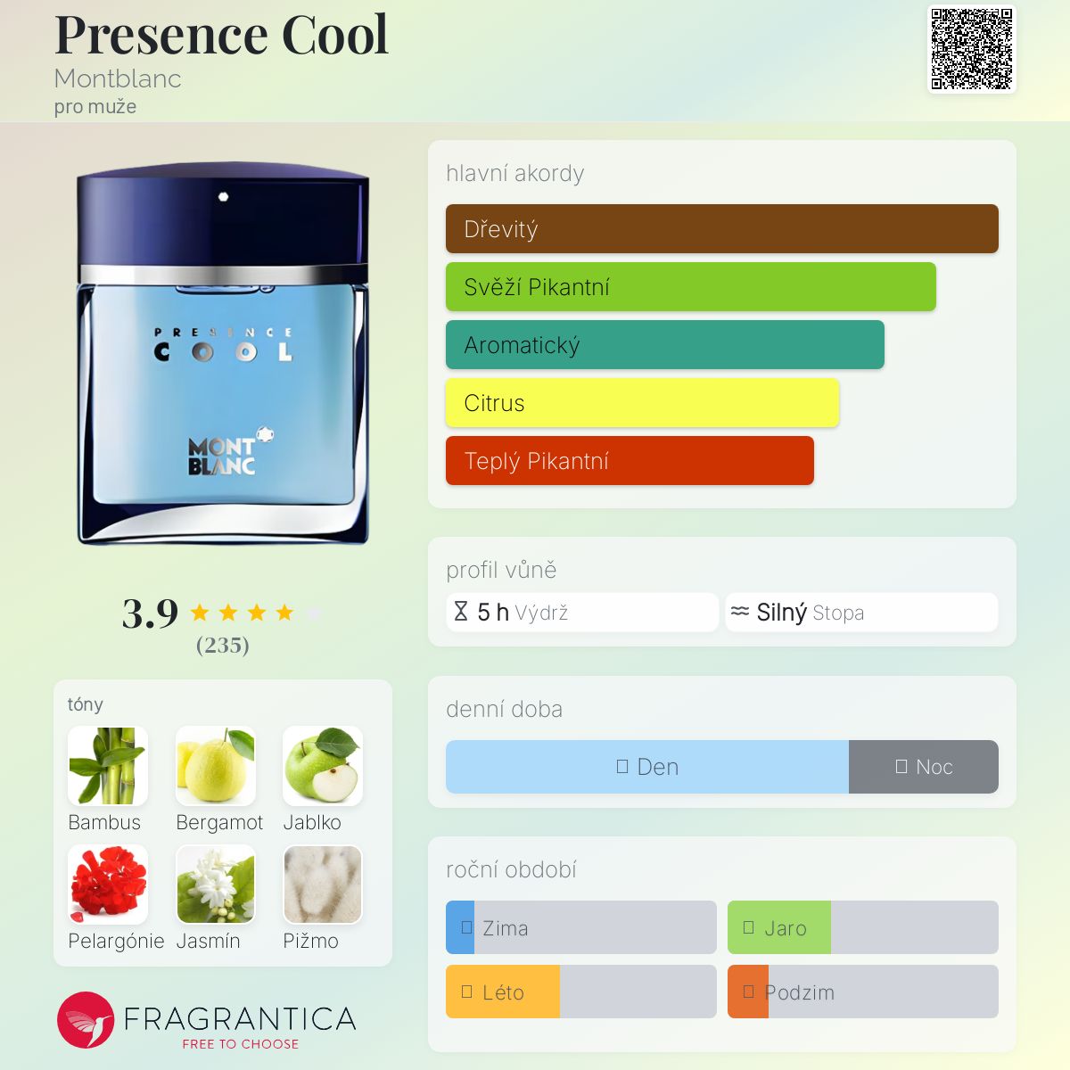Presence Cool podle Montblanc je Aromatic Fougere vůně pro muže. Presence Cool byl/a uveden/a v roce 2002. Vrchní tóny jsou Bambus, Bergamot a Granny Smith jablko; střední tóny jsouPelargónie a Jasmín ; základní tóny jsou Pižmo, Santalové dřevo, Pačuli, Jantar (ambra) a Fazole tonka.