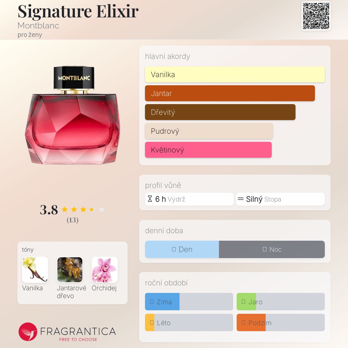 Signature Elixir podle Montblanc je Orientální Floral vůně pro ženy. Toto je nová vůně. Signature Elixir byl/a uveden/a v roce 2025. Vrchní tón je Orchidej ; střední tón jeVanilka ; základní tón je Jantarové dřevo.