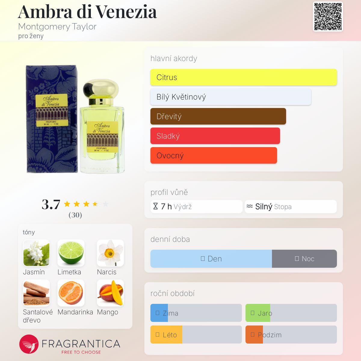 Ambra di Venezia podle Montgomery Taylor je Floral Fruity vůně pro ženy. Ambra di Venezia byl/a uveden/a v roce 1998. "Nosem" za touto vůní je Rayda Vega.