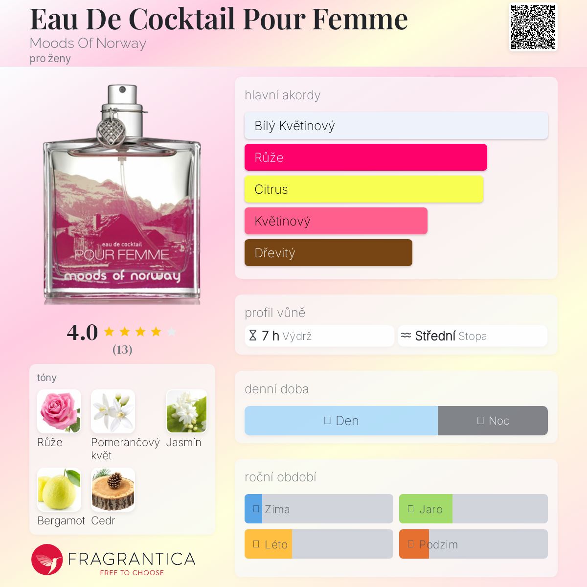 Eau De Cocktail Pour Femme podle Moods Of Norway je Floral vůně pro ženy. Eau De Cocktail Pour Femme byl/a uveden/a v roce 2011. Vrchní tón je Bergamot ; střední tóny jsouRůže, Pomerančový květ a Jasmín ; základní tón je Cedr.