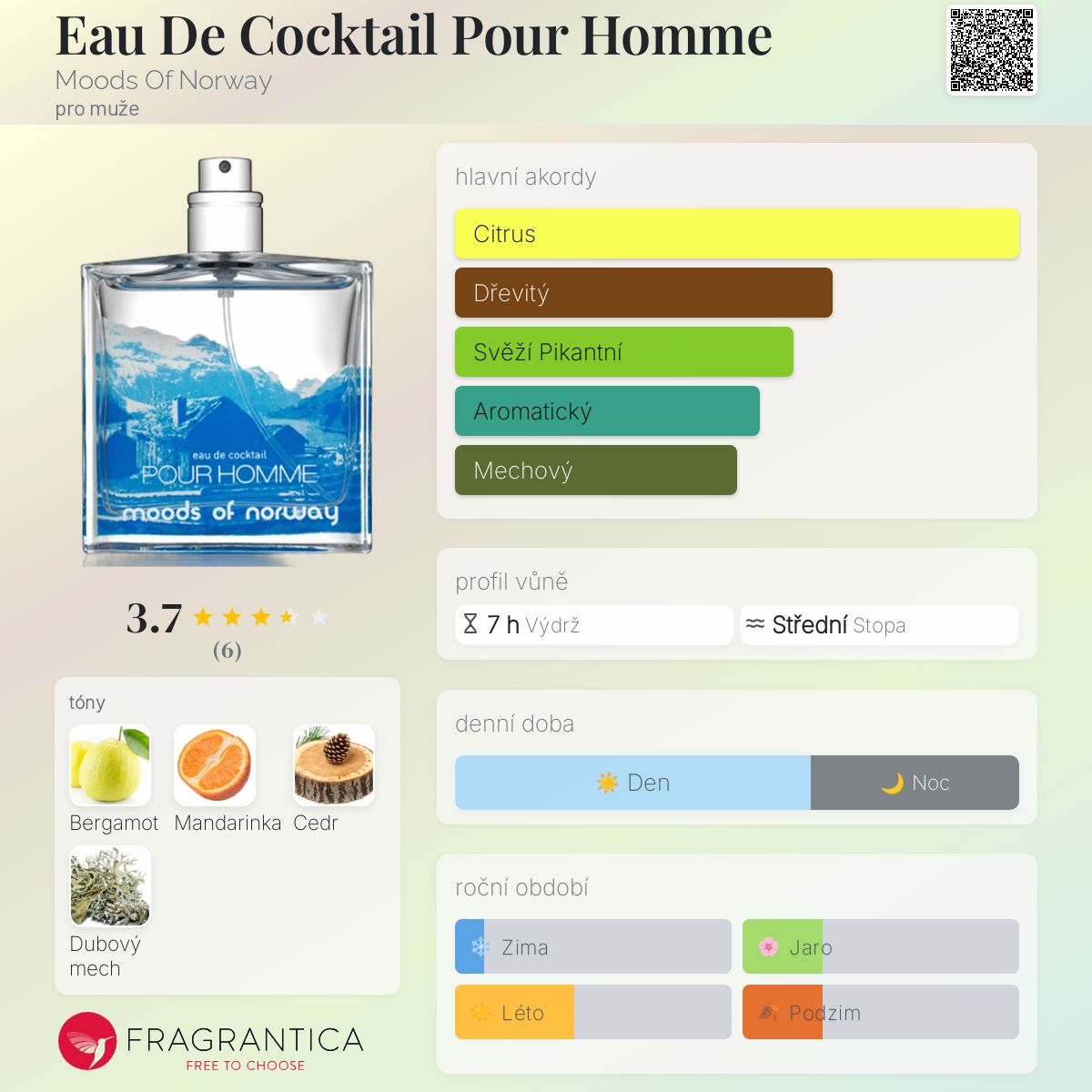 Eau De Cocktail Pour Homme podle Moods Of Norway je Aromatic Fougere vůně pro muže. Eau De Cocktail Pour Homme byl/a uveden/a v roce 2011. Vrchní tóny jsou Bergamot a Mandarinka; střední tón jeCedr ; základní tón je Dubový mech.