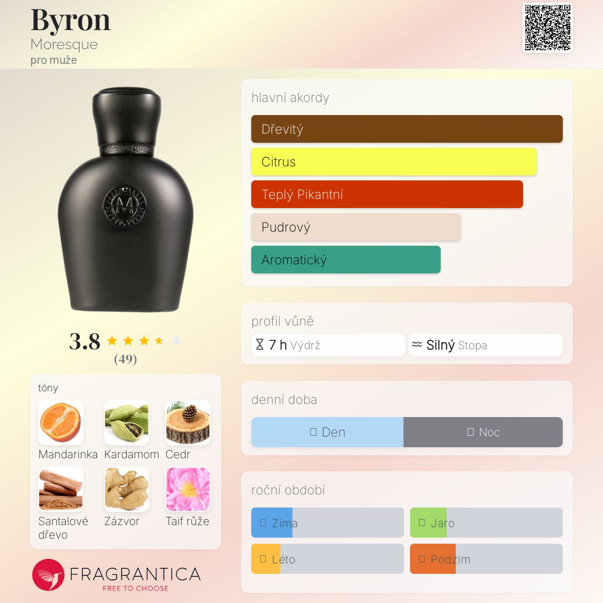 Byron podle Moresque je Orientální Woody vůně pro muže. Byron byl/a uveden/a v roce 2022. Vrchní tóny jsou Mandarinka, Zázvor, Citrón, Bergamot a Růžový pepř; střední tóny jsouKardamom, Taif růže, Šafrán, Magnólie a Jasmín ; základní tóny jsou Cedr, Santalové dřevo, Pačuli, Cypriolový olej, Pižmo, Vanilka a Jantar (ambra).