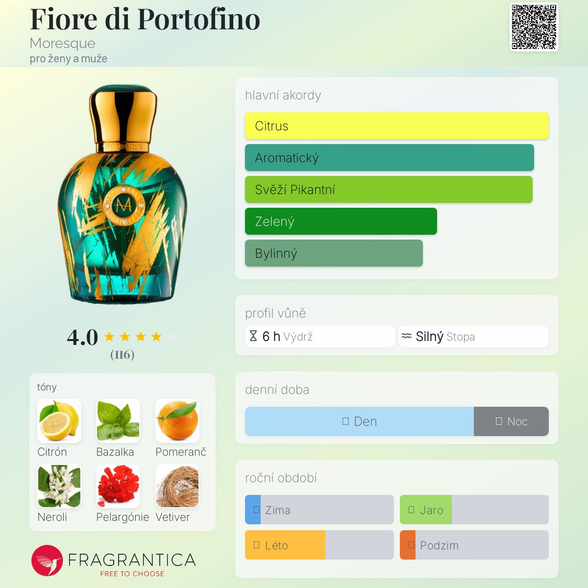 Fiore di Portofino podle Moresque je Floral vůně pro ženy a muže. Fiore di Portofino byl/a uveden/a v roce 2016. "Nosem" za touto vůní je Andrea (Thero) Casotti. Vrchní tóny jsou Italský citrón, Bazalka, Sicilský pomeranč a Neroli; střední tóny jsouPelargónie, Toskánský kosatec, Mimóza a Karafiát ; základní tóny jsou Haitský vetiver, Pižmo a Jantar (ambra).