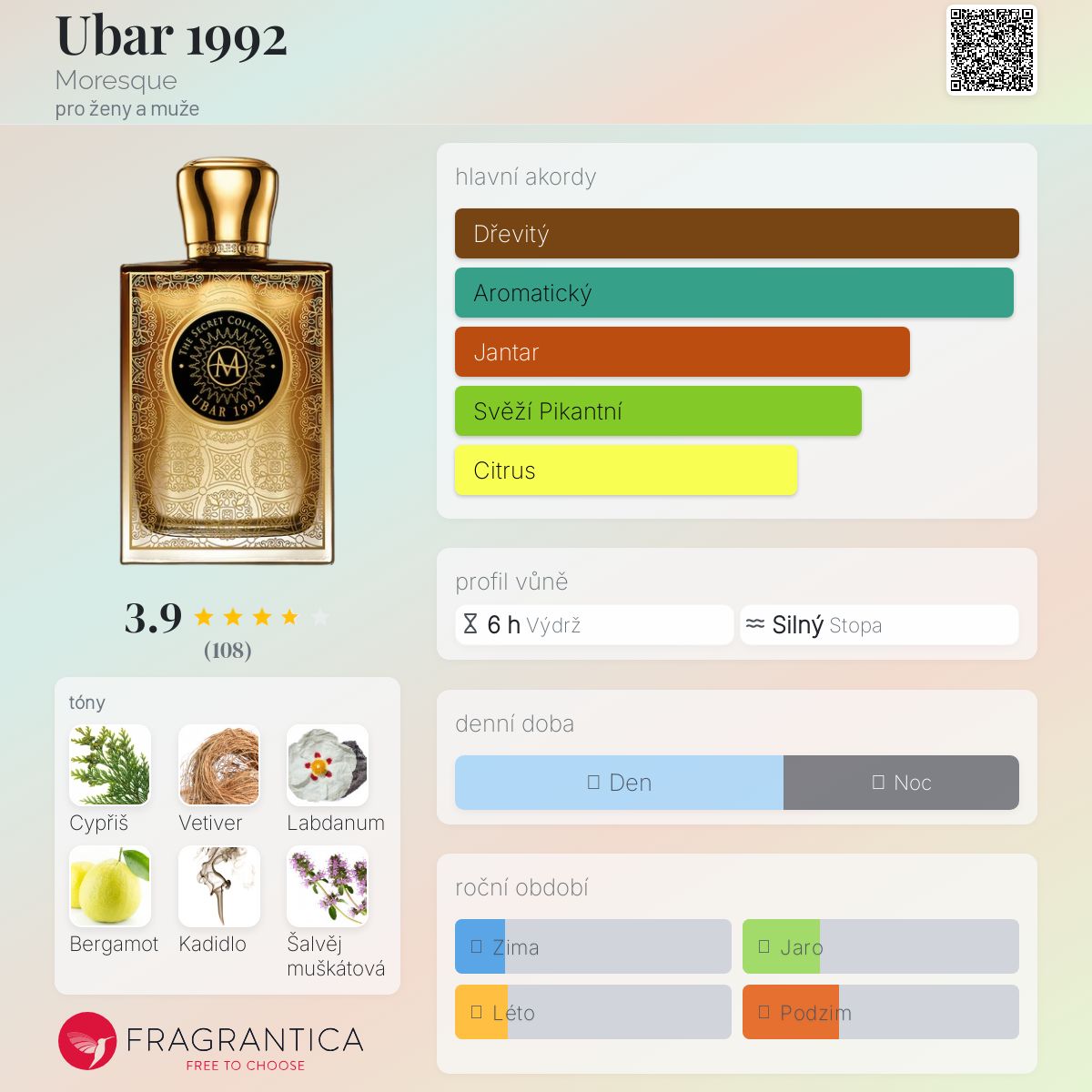 Ubar 1992 podle Moresque je Orientální vůně pro ženy a muže. Ubar 1992 byl/a uveden/a v roce 2018. Vrchní tóny jsou Cypřiš a Bergamot; střední tóny jsouKadidlo, Šalvěj muškátová a Černý pepř ; základní tóny jsou Vetiver, Labdanum, Pačuli a Kůže.