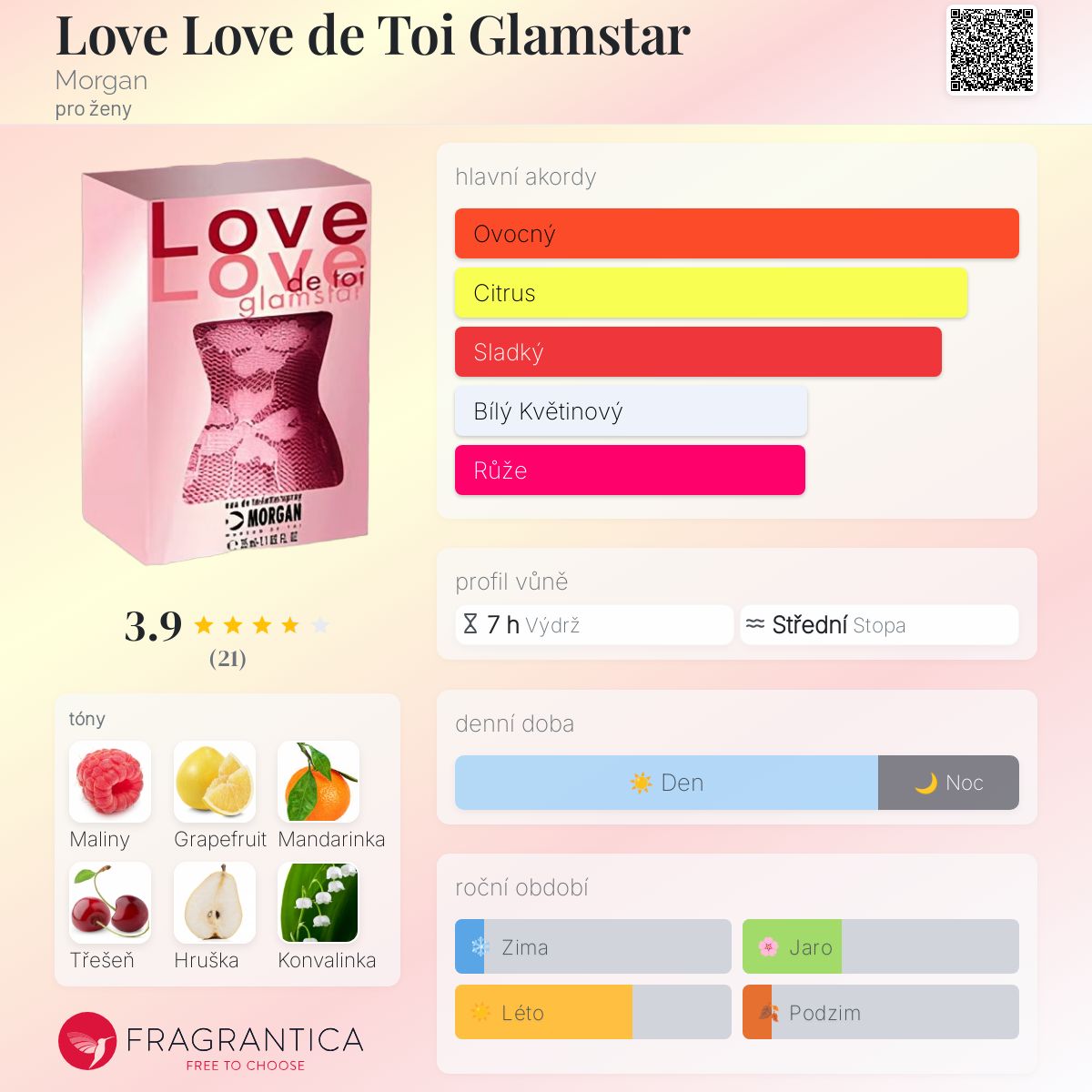 Love Love de Toi Glamstar podle Morgan je Floral Fruity vůně pro ženy. Love Love de Toi Glamstar byl/a uveden/a v roce 2007. Vrchní tóny jsou Maliny, Růžový grapefruit, Mandarinka a Hruška; střední tóny jsouKonvalinka, Růže, Granátové jablko a Jasmín ; základní tóny jsou Třešeň, Pižmo a Santalové dřevo.