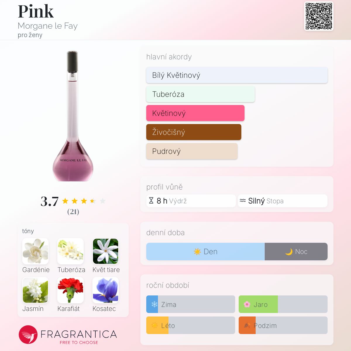 Pink podle Morgane le Fay je Floral vůně pro ženy. Pink byl/a uveden/a v roce 2008. Vrchní tóny jsou Bergamot, Pomeranč a Fíkový list; střední tóny jsouGardénie, Tuberóza, Květ tiare, Jasmín, Karafiát, Ylang-Ylang, Konvalinka, Vonokvětka a Pelargónie ; základní tóny jsou Kosatec, Vanilka a Pižmo.