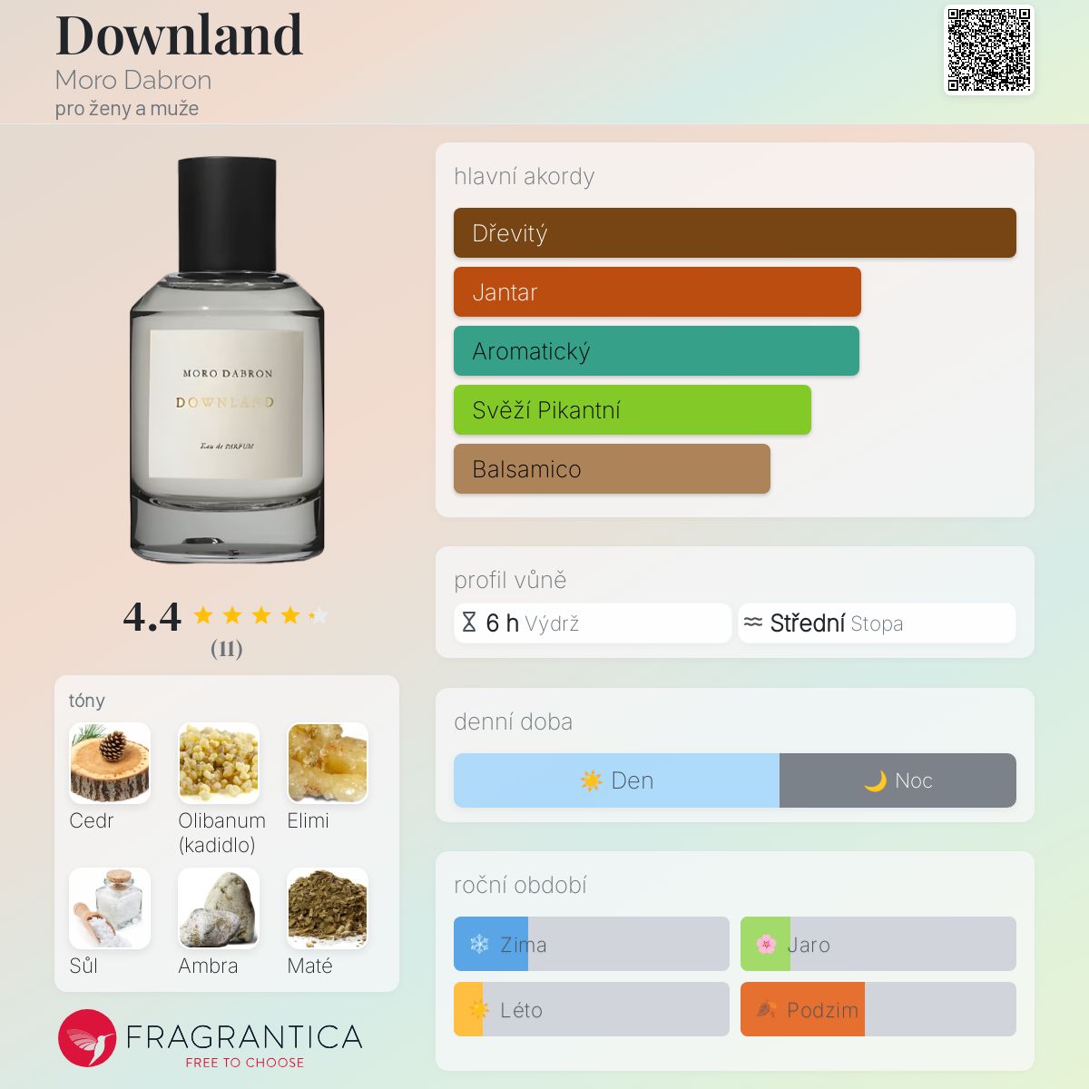 Downland podle Moro Dabron je Woody vůně pro ženy a muže. Downland byl/a uveden/a v roce 2023. "Nosem" za touto vůní je Vincent Ricord. Vrchní tóny jsou Elimi a Mořská sůl; střední tóny jsouCedr, Olibanum, Ambra, Maté a Čaj ; základní tóny jsou Santalové dřevo, Vetiver a Seno.