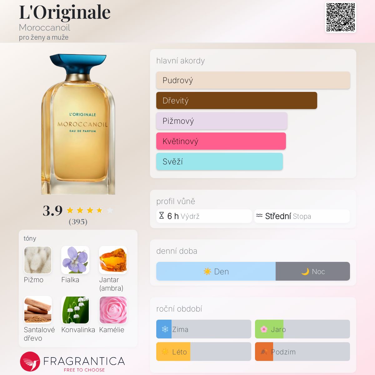 L'Originale podle Moroccanoil je Orientální Floral vůně pro ženy a muže. Toto je nová vůně. L'Originale byl/a uveden/a v roce 2025. Vrchní tóny jsou Fialka, Kamélie a Citrusy; střední tóny jsouKonvalinka, Dřevité tóny a Vanilka ; základní tóny jsou Pižmo, Jantar (ambra) a Bílé santalové dřevo.