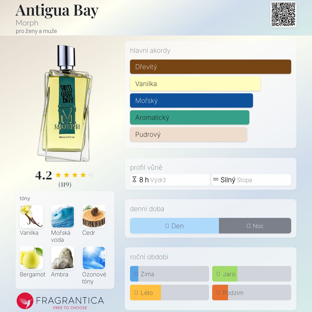 Antigua Bay podle Morph je vůně pro ženy a muže. Antigua Bay byl/a uveden/a v roce 2023. "Nosem" za touto vůní je Arturetto Landi. Vrchní tóny jsou Mořské tóny, Bergamot a Černý pepř; střední tóny jsouOzonové tóny, Pačuli a Bílé květy ; základní tóny jsou Vanilka, Cedr, Ambra, Santalové dřevo a Bílé pižmo.