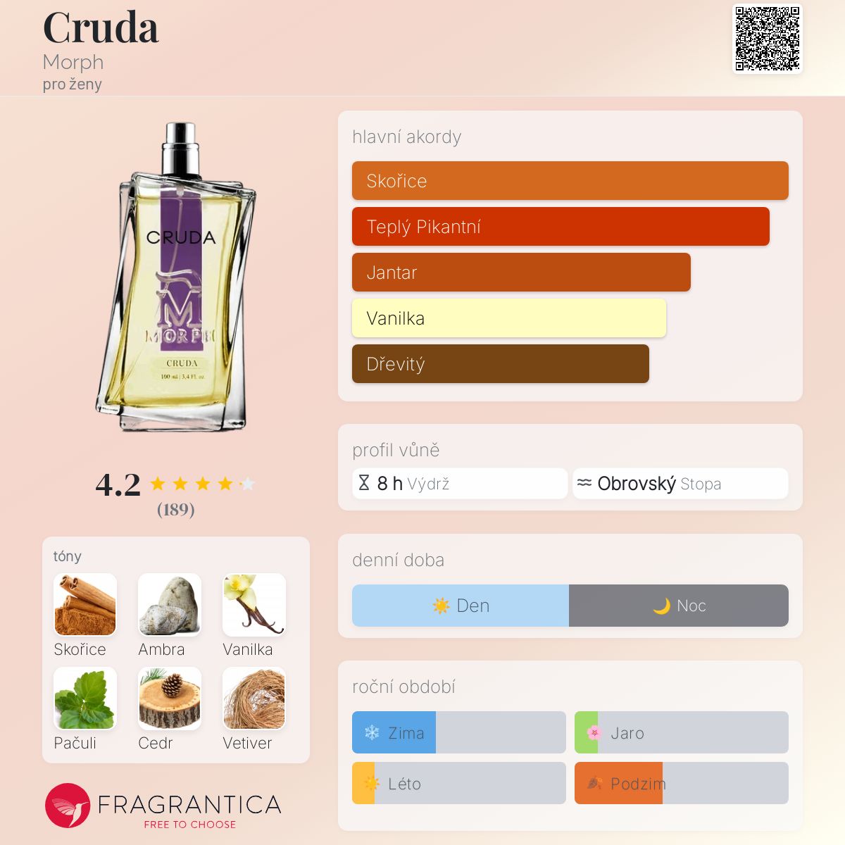 Cruda podle Morph je Orientální Floral vůně pro ženy. Vrchní tóny jsou Ambra, Damašská růže a Bílé květy; střední tóny jsouSkořice, Vanilka a Pačuli ; základní tóny jsou Cedr a Vetiver.
