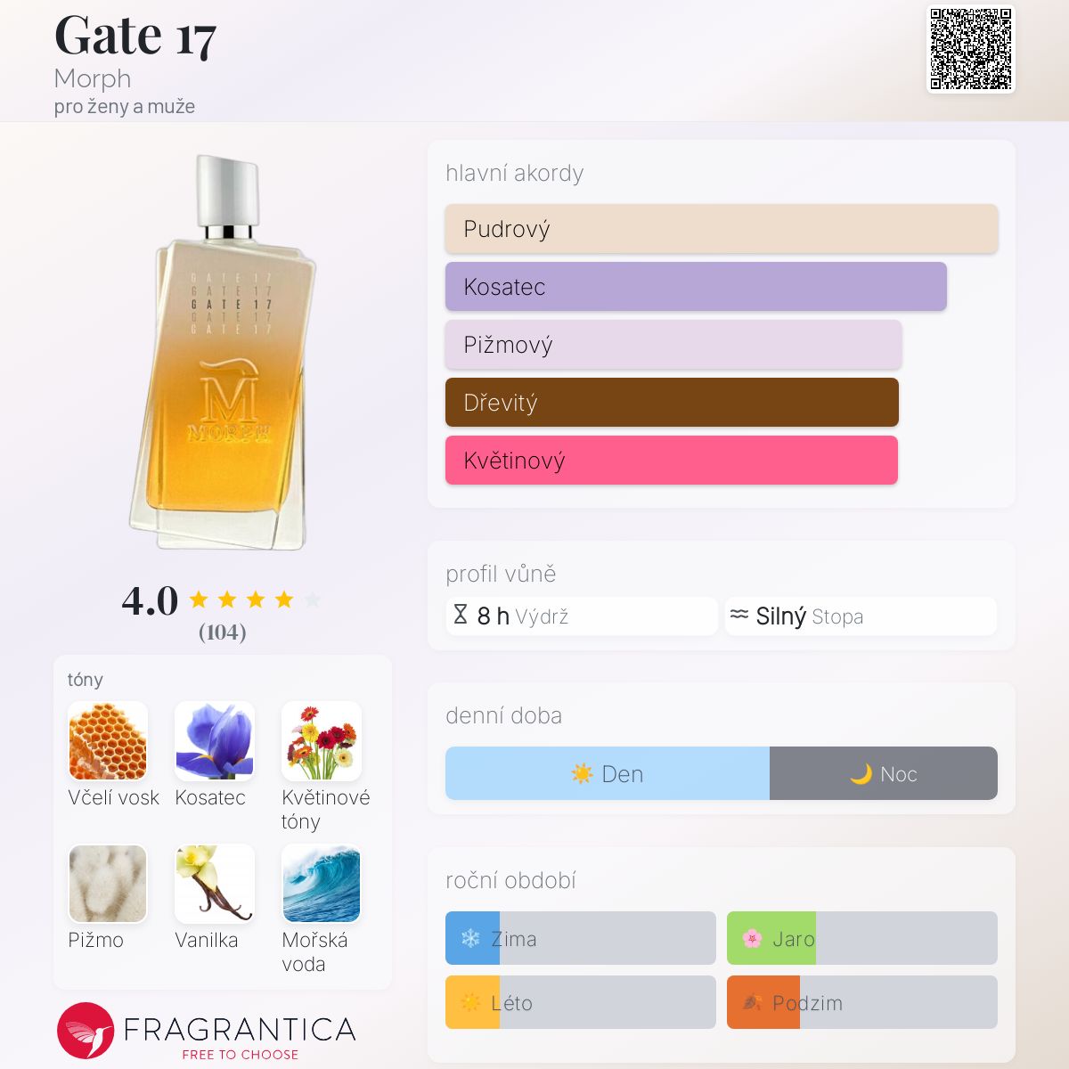 Gate 17 podle Morph je Orientální Floral vůně pro ženy a muže. Toto je nová vůně. Gate 17 byl/a uveden/a v roce 2024. "Nosem" za touto vůní je Christian Carbonnel. Vrchní tóny jsou Včelí vosk, Květinové tóny a Bergamot; střední tóny jsouKosatec, Pižmo, Mořské tóny, Kašmírové dřevo a Jantar (ambra) ; základní tóny jsou Vanilka a Vetiver.